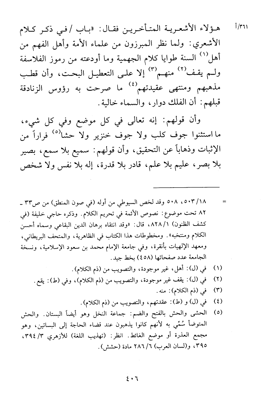 هؤلاء الأشعرية المتأخرين فقال باب في ذكر كلام الأشعري ولما نظر المبرزون من علماء الأمة إلا على التعطيل البحت وأن قطب مذهبهم ومنتهى عقيدتهم ما صرحت به رؤوس الزنادقة إنه تعالى في كل موضع وفي كل شيء وما استثنوا جوف كلب ولا جوف خنزير ولا حشا فراراً من الإثبات وذهاباً عن التحقيق وأن ولهم سميع بلا سمع بصير بلا بصر عليم بلا علم قادر بلا قدرة إله بلا نفس ولا شخص