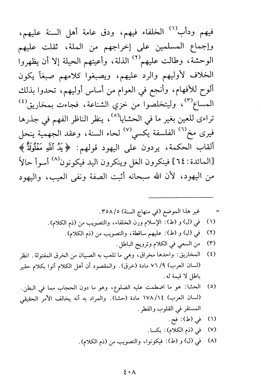 فيهم ودأب الخلفاء فيهم ودق عامة أهل السنة عليهم وإجماع المسلمين على إخراجهم من الملة ثقلت عليهم الوحشة وطالت عليهم الذلة وأعيتهم الحيلة إلا أن يظهروا الخلاف لأوليهم والرد عليهم ويصبغوا كلامهم صبغاً يكون ألواح للأفهام وأنجع في العوام من أساس أوليهم تحدوا بذلك المساع وليتخلصوا من خزي الشناعة فجاءت بمخازيق تراءى للعين بغير ما في الحشايا ينظر الناظر الفهم في جذرها فيرى مخ الفلسفة يكسي لحاء السنة وعقد الجهمية وينحل ألقاب الحكمة يردون على اليهود قولهم يَدُ اللهِ مَغْلُولَةٌ [المائدة 64] فينكرون الغل وينكرون اليد فيكونون أسوأ حالاً من اليهود لأن الله سبحانه أثبت الصفة ونفى العيب واليهود