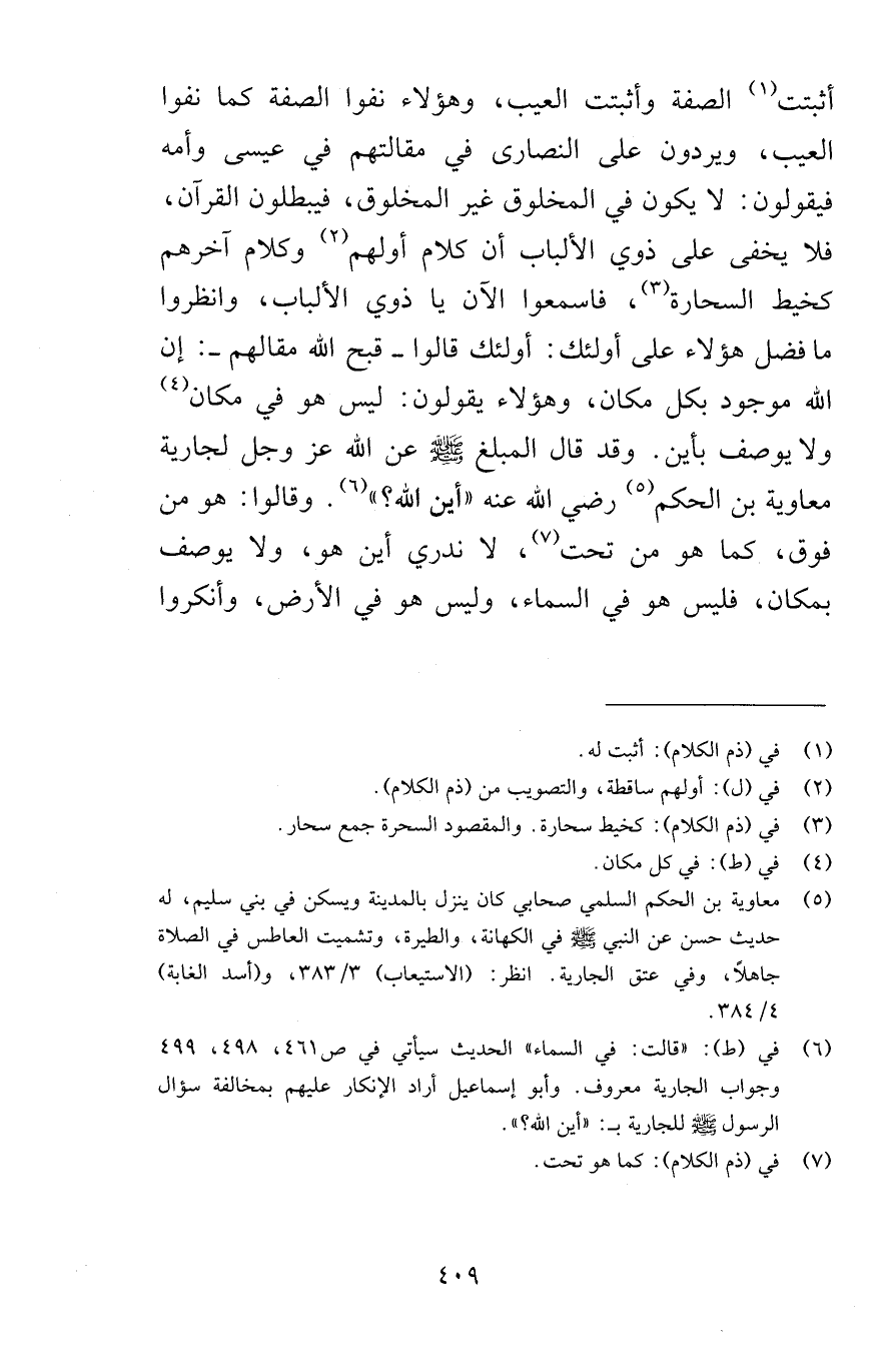 أثبتت الصفة وأثبتت العيب وهؤلاء نفوا الصفة كما نفوا العيب ويردون على النصارى في مقالتهم في عيسى وأمه فيقولون لا يكون في المخلوق غير المخلوق فيبطلون القرآن فلا يخفى على ذوي الألباب أن كلام أولهم وكلام آخرهم كخيط السحارة فاسمعوا الآن يا ذوي الألباب وانظروا ما فضل هؤلاء على أولئك أولئك قالوا قبح الله مقالهم إن الله موجود بكل مكان وهؤلاء يقولون ليس هو في مكان ولا يوصف بأين وقد قال المبلغ صلى الله عليه وسلم عن الله عز وجل لجارية معاوية بن الحكم رضي الله عنه أين الله وقالوا هو من فوق كما هو من تحت لا ندري أين هو ولا يوصف بمكان فليس هو في السماء وليس هو في الأرض وأنكروا