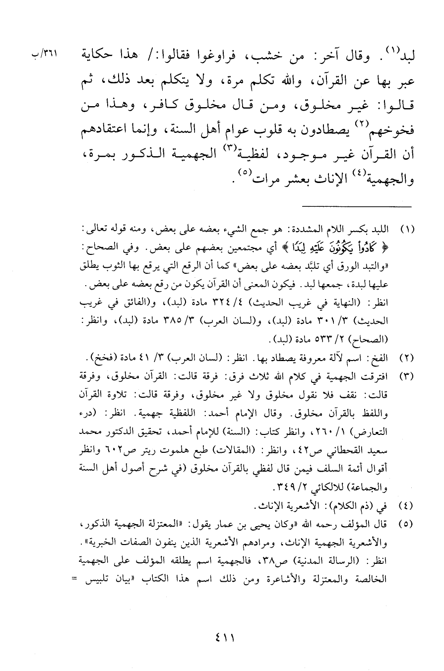 لبد وقال الآخر من خشب فراوغوا فقالوا هذا حكاية عبر بها عن القرآن والله تكلم مرة ولا يتكلم بعد ذلك ثم قالوا غير مخلوق ومن قال مخلوق كافر وهذا من فخوخهم يصطادون به قلوب عوام أهل السنة وإنما اعتقادهم أن القرآن غير موجود لفظية الجهمية الذكور بمرة والجهمية الإناث بعشر مرات