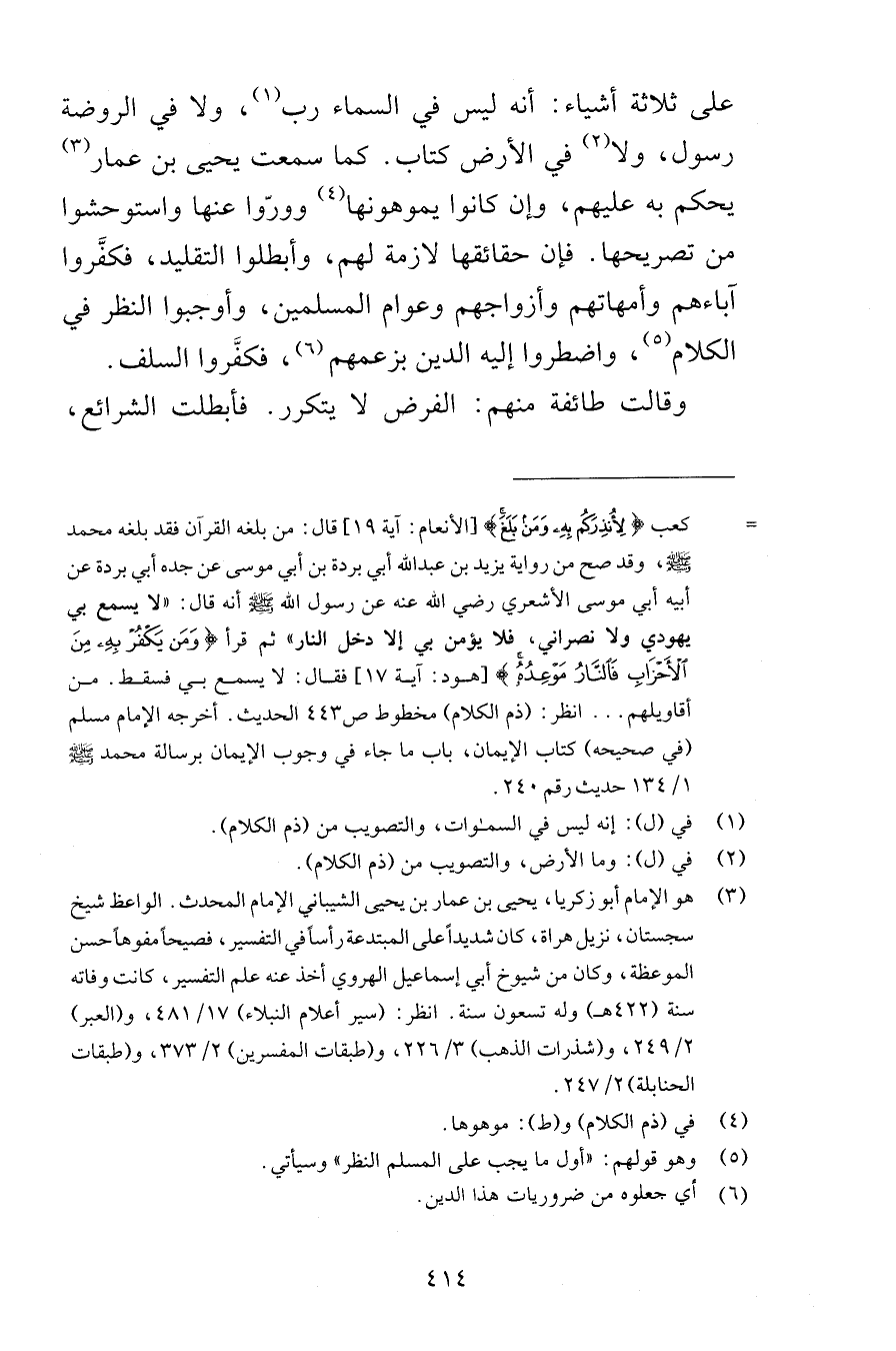 على ثلاثة أشياء أنه ليس في السماء رب وفي الروضة رسول ولا في الأرض كتاب كما سمعت يحيى بن عمار يحكم به عليهم وإن كانوا يموهونها وورّوا عنها واستوحشوا من تصريحها فإن حقائقها لازمة لهم وأبطلوا التقليد فكفَّروا آباءهم وأمهاتهم وأزواجهم وعوام المسلمين وأوجبوا النظر في الكلام واضطروا إليه الدين بزعمهم فكفَّروا السلف وقالت طائفة منهم الفرض لا يتكرر فأبطلت الشرائع