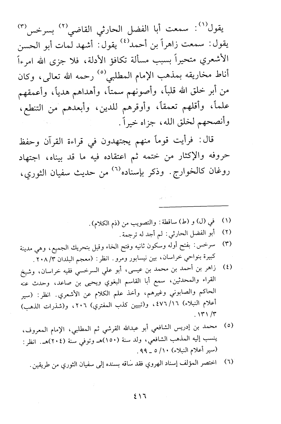 يقول سمعت أبا الفضل الحارثي القاضي بسرخس يقول سمعت زاهراً بن أحمد يقول أشهد لما مات أبو الحسن الأشعري متحيراً بسبب مسألة تكافؤ الأدلة فلا جزى الله امرءاً أناط مخاريقه بمذهب الإمام المطلبي رحمه الله تعالى وكان من أبر خلق الله قلباً وأصونهم سمتاً وأهداهم هدياً وأعمقهم علماً وأقلهم تعمقاً وأوقرهم للدين وأبعدهم من التنطع وأنصحهم لخلق الله جزاه خيراً قال فرأيت قوماً منهم يجتهدون في قراءة القرآن وحفظ حروفه والإكثار من ختمه ثم اعتقاده فيه ما قد بيناه اجتهاد روغان كالخوارج وذكر بإسناده من حديث سفيان الثوري