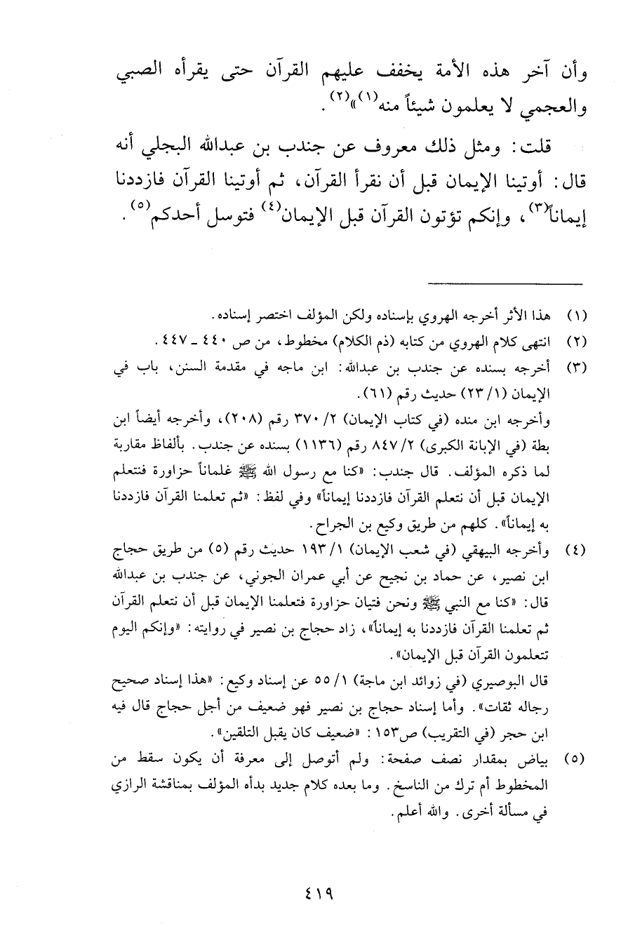 وأن آخر هذه الأمة يخفف عليهم القرآن حتى يقرأه الصبي والعجمي لا يعلمون شيئاً منه قلت ومثل ذلك معروف عن جندب بن عبد الله البجلي أنه قال أوتينا الإيمان قبل أن نقرأ القرآن ثم أوتينا القرآن فازددنا إيماناً وإنكم تأتون القرآن قبل الإيمان فتوسل أحدكم