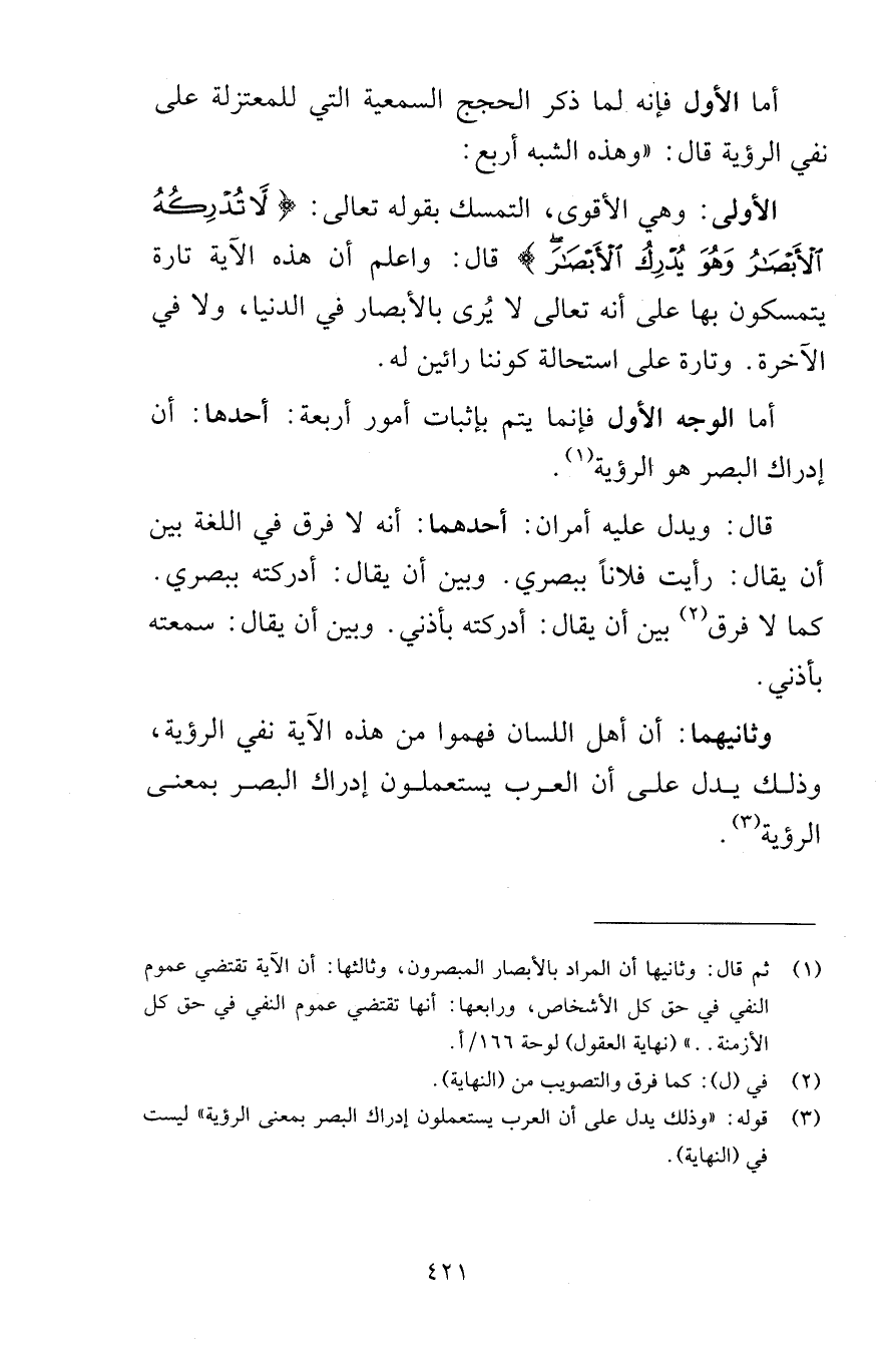 أما الأول فإنه لما ذكر الحجج السمعية التي للمعتزلة على نفي الرؤية قال وهذه الشبه أربع الأولى وهي الأقوى التمسك بقوله تعالى لاَّ تُدْرِكُهُ الأَبْصَارُ وَهُوَ يُدْرِكُ الأَبْصَارَ قال واعلم أن هذه الآية تارة يتمسكون بها على أنه تعالى لا يُرى بالأبصار في الدنيا ولا في الآخرة وتارة على استحالة كوننا رائين له أما الوجه الأول فإنما يتم بإثبات أمور أربعة أحدها أن إدراك البصر هو الرؤية قال ويدل عليه أمران أحدهما أنه لا فرق في اللغة بين أن رأيت فلاناً ببصري وبين أن يقال أدركته ببصري كما لا فرق بين أن يقال أدركته بأذني وسمعته بأذني وثانيهما أن أهل اللسان فهموا من هذه الآية نفي الرؤية وذلك يدل على أن العرب يستعملوا إدراك البصر بمعنى الرؤية