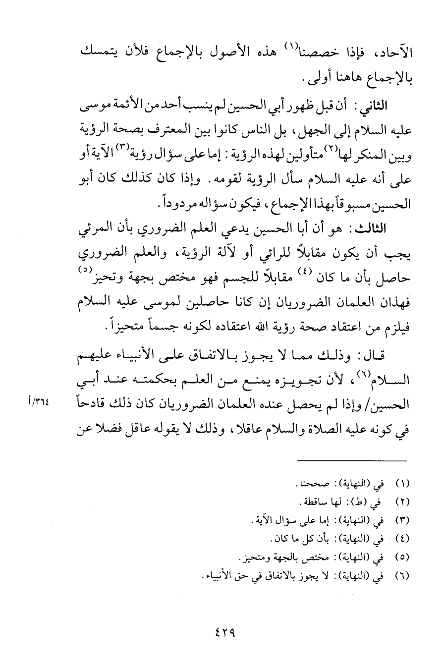 الآحاد فإذا خصنا هذه الأصول بالإجماع فلأن يتمسك بالإجماع هاهنا أولى الثاني أن قبل ظهور أبي الحسين لم ينسب أحد من الأئمة موسى عليه السلام إلى الجهل بل الناس كانوا بين المعترف بصحة الرؤية وبين المنكر لها متأولين لهذه الرؤية إما على سؤال رؤية الآية أو على أنه عليه السلام سأل الرؤية لقومه وإذا كان كذلك كان أبو الحسين مسبوقاً بهذا الإجماع فيكون سؤاله مردوداً الثالث وهو أن أبا الحسين يدعي العلم الضروري بأن المرئي يجب أن يكون مقابلاً للرائي أو لآلة الرؤية والعلم الضروري حاصل بأن ما كان مقابلاً للجسم فهو مختص بجهة وتحيز فهذان العلمان الضروريان إن كانا حاصلين لموسى عليه السلام فيلزم من اعتقاد صحة رؤية الله اعتقاده لكونه جسماً متحيزاً قال وذلك ما لا يجوز بالاتفاق على الأنبياء عليهم السلام لأن تجويزه يمنع من العلم بحكمته عند أبي الحسين وإذا لم يحصل عنده العلمان الضروريان كان ذلك قادحاً في كونه عليه الصلاة والسلام عاقلاً وذلك لا يقوله عاقل فضلا عن