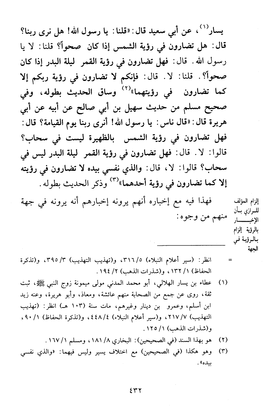 يسار عن أبي سعيد قال قلنا يا رسول اله هل نرى ربنا قال هل تضارون في رؤية الشمس إذا كان صحواً قلنا لا يا رسول الله قال فهل تضارون من رؤية القمر ليلة البدر إذا كان صحواً قلنا لا قال فإنكم لا تضارون في رؤية ربكم إلا كما تضارون في رؤيتهما وساق الحديث بطوله وفي صحيح مسلم من حديث سهيل بن أبي صالح عن أبيه عن أبي هريرة قال قال ناس يا رسول الله أنرى ربنا يوم القيامة قال فهل تضارون في رؤية الشمس بالظهيرة ليست في سحاب قالوا لا قال فهل تضارون في رؤية القمر ليلة البدر ليس في سحاب قالوا لا قال والذي نفسي بيده لا تضارون في رؤيته إلا كما تضارون في رؤية أحدهما وذكر الحديث بطوله فهذا فيه مع إخباره أنهم يرونه إخبارهم أنه يرونه في جهة منهم من وجوه