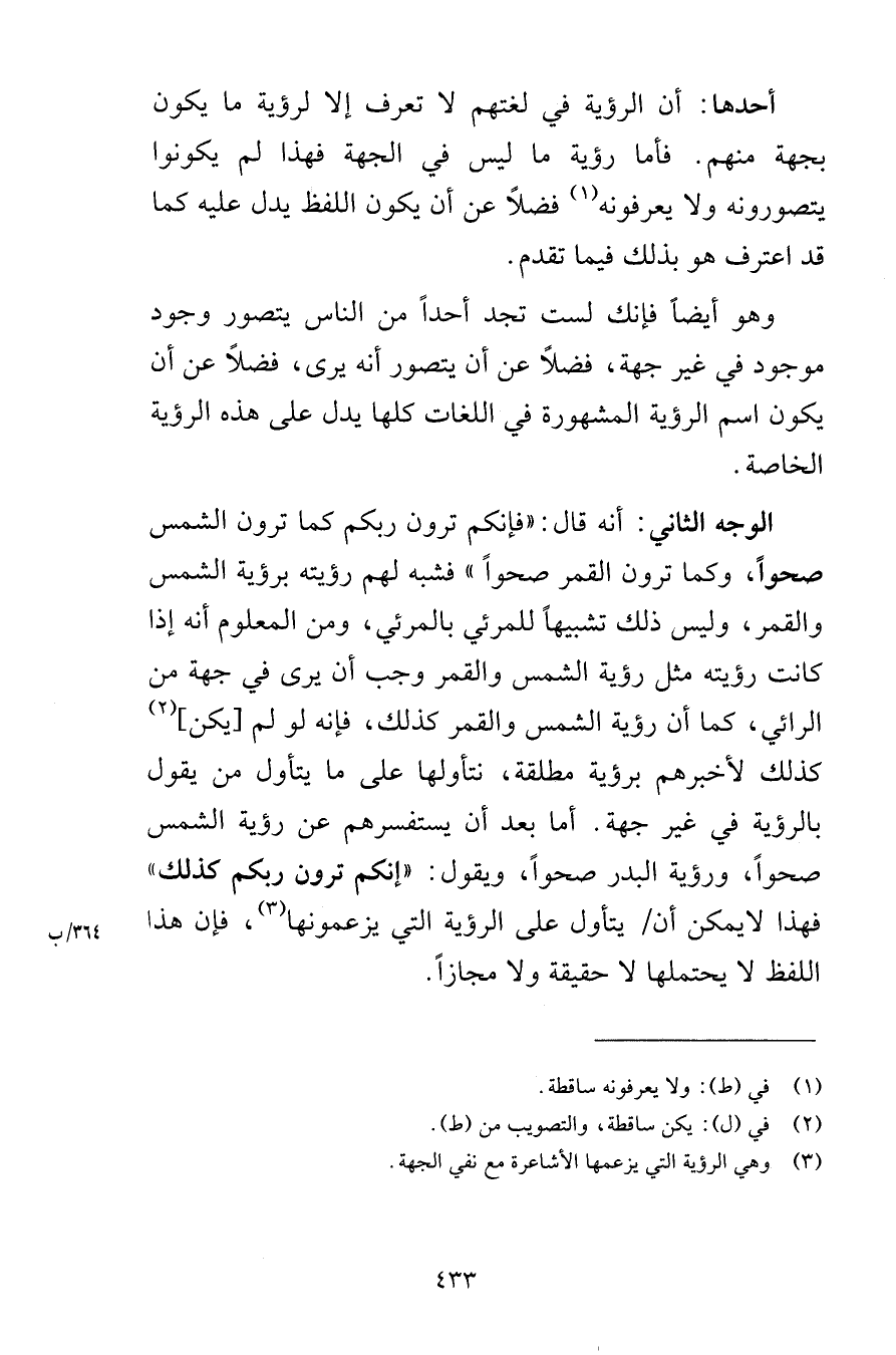 أحدها أن الرؤية في لغتهم لا تعرف إلا لرؤية ما يكون بجهة منهم فأما رؤية ما ليس في الجهة فهذا لم يكونوا يتصورونه ولا يعرفونه فضلاً عن أن يكون اللفظ يدل عليه كما قد اعترف هو بذلك فيما تقدم وهو أيضاً فإنك لست تجد أحداً من الناس يتصور وجود موجود في غير جهة فضلاً عن أن يتصور أنه يرى فضلاً عن أن يكون اسم الرؤية المشهورة في اللغات كلها يدل على هذه الرؤية الخاصة الوجه الثاني أنه قال فإنكم ترون ربكم كما ترون الشمس صحواً وكما ترون القمر صحواً فشبه هم رؤيته برؤية الشمس والقمر وليس ذلك تشبيهاً للمرئي بالمرئي ومن المعلوم أنه إذا كانت رؤيته مثل رؤية الشمس والقمر وجب أن يرى في جهة من الرائي كما أن رؤية الشمس والقمر كذلك فإنه لو لم يكن كذلك لأخبرهم برؤية مطلقة نتأولها على ما يتأول من يقول بالرؤية في غير جهة أما بعد أن يستفسرهم عن رؤية الشمس صحواً ورؤية البدر صحواً ويقو إنكم ترون ربكم كذلك فهذا لا يمكن أن يتأول على الرؤية التي يزعمونها فإن هذا اللفظ لا يحتملها لا حقيقة ولا مجازاً