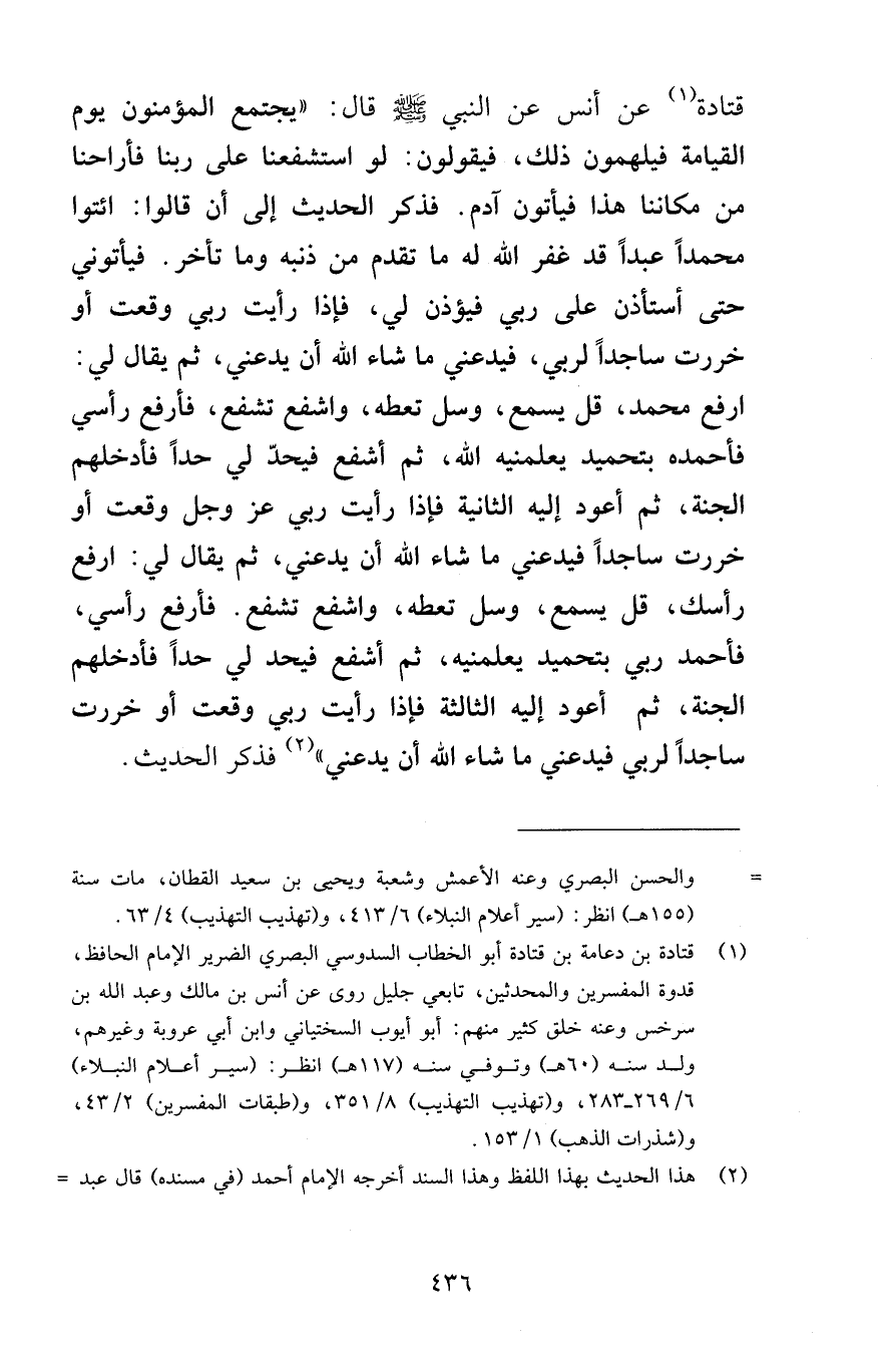 قتادة عن أنس عن النبي صلى الله عليه وسلم قال يجتمع المؤمنون يوم القيامة فيلهمون ذلك فيقولون لو استشفعنا على ربنا فأراحنا من مكاننا هذا فيأتون آدم فذكر الحديث إلى أن قالوا ائتوا محمداً عبداً قد غفر الله له ما تقدم من ذنبه وما تأخر فيأتوني حتى أستأذن على ربي فيؤذن لي فإذا رأيت ربي وقعت أو خررت ساجداً لربي فيدعني ما يشاء الله أن يدعني ثم يقال لي ارفع محمد قل يسمع وسل تعطه واشفع تشفع فأرفع رأسي فأحمده بتحميد يعلمنيه الله ثم أشفع فيحدّ لي حداً فأدخلهم الجنة ثم أعود إليه الثانية فإذا رأيت ربي عز وجل وقعت أو خررت ساجداً فيدعني ما شاء الله أن يدعني ثم يقال لي ارفع رأسك قل يسمع وسل تعطه واشفع تشفع فأرفع رأسي فأحمد ربي بتحميد يعلمنيه ثم أشفع فيحد لي حداً فأدخلهم الجنة ثم أعود إليه الثالثة فإذا رأيت ربي وقعت أو خررت ساجداً لربي فيدعني ما شاء الله أن يدعني فذكر الحديث