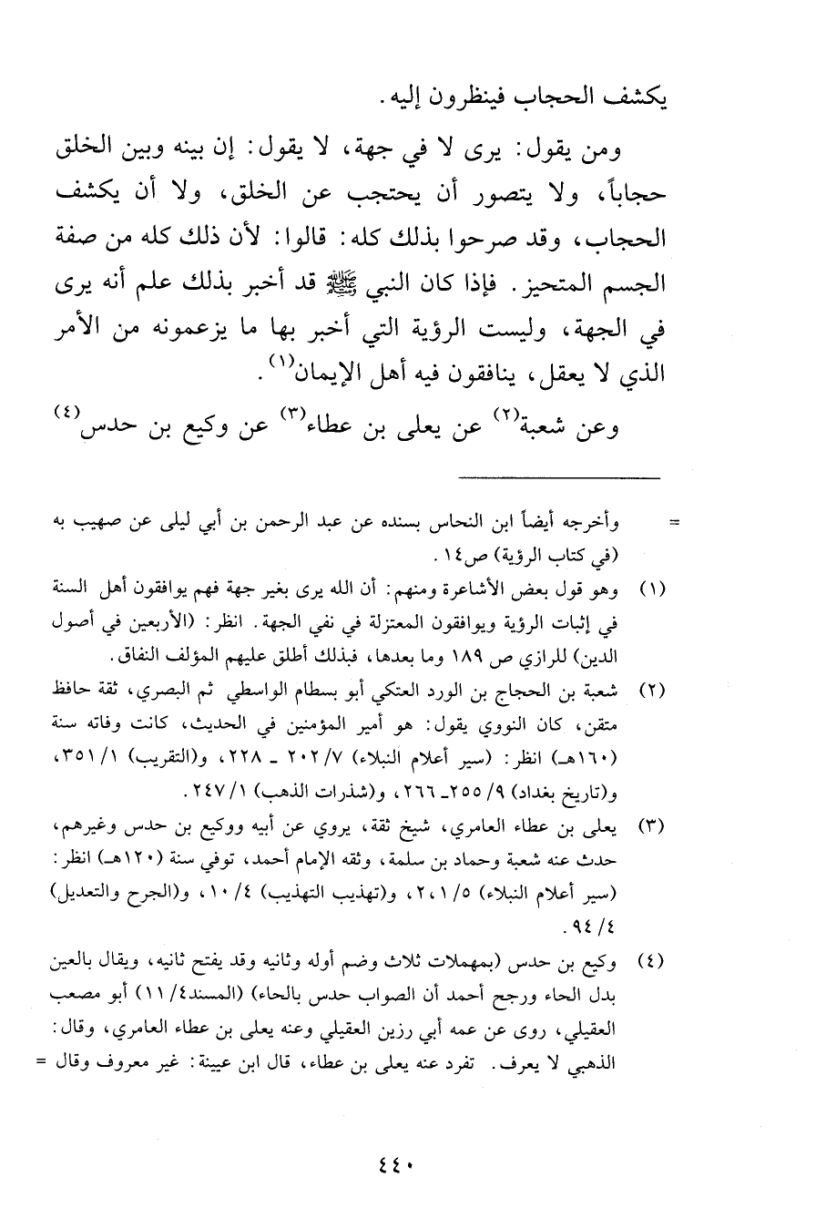 يكشف الحجاب فينظرون إليه ومن يقول يرى لا في جهة لا يقول إن بينه وبين الخلق حجاباً ولا يتصور أن يحتجب عن الخلق وأن يكشف الحجاب وقد صرحوا بذلك كله قالوا لأن ذلك كله من صفة الجسم المتحيز فإذا كان النبي صلى الله عليه وسلم قد أخبر بذلك علم أنه يرى في الجهة وليست الرؤية التي أخبر بها ما يزعمونه من الأمر الذي لا يعقل ينافقون فيه أهل الإيمان وعن شعبة بن يعلى بن عطاء عن وكيع بن حدس
