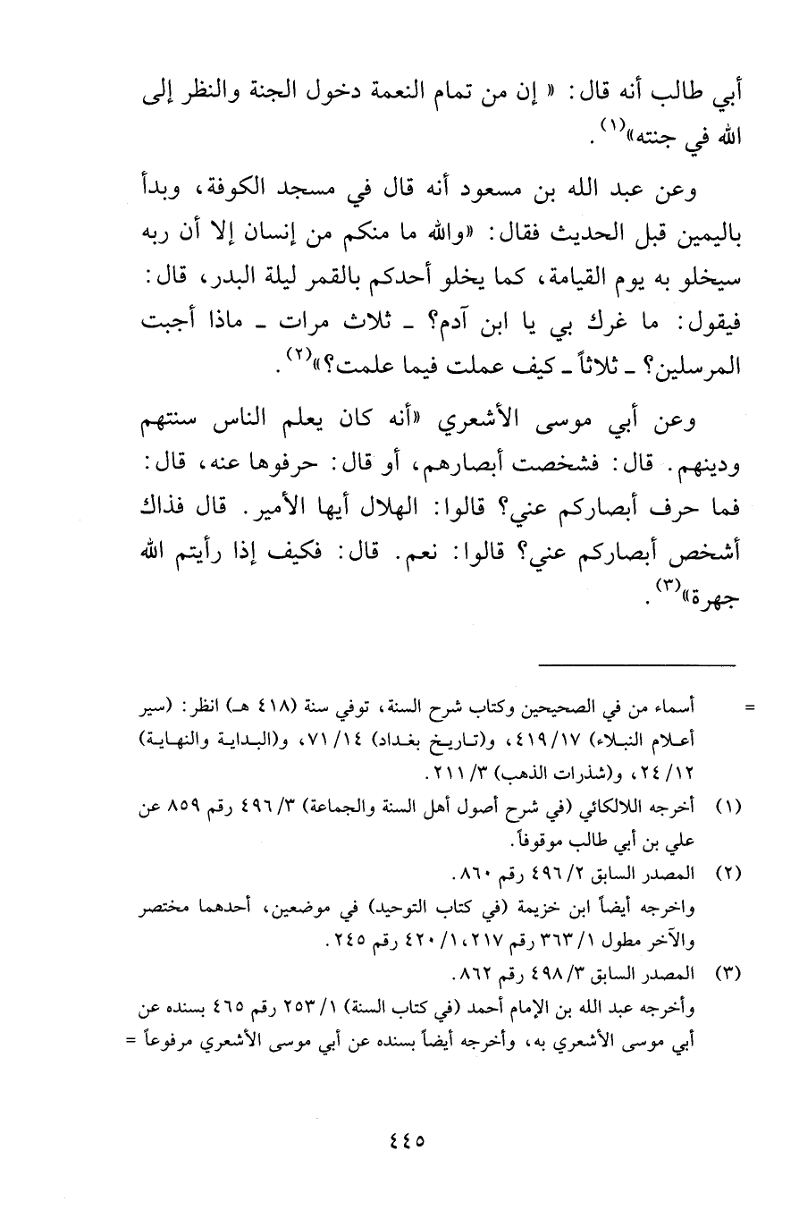 أبي طالب أنه قال إن من تمام دخول الجنة والنظر إلى الله في جنته وعن عبد الله بن مسعود أنه قال في مسجد الكوفة وبدأ باليمين قبل الحديث فقال والله ما منكم من إنسان إلا أن ربه سيخلو به يوم القيامة كما يخلو أحدكم بالقمر ليلة البدر قال فيقول ما غرك بي يا ابن آدم ثلاث مرات ماذا أجبت المرسلين ثلاثاً كيف علمت فيما علمت وعن أبي موسى الأشعري أنه كان يعلم الناس سنتهم ودينهم قال فشخصت أبصارهم أو قال حرفوها عنه قال فما حرف أبصاركم عني قالوا الهلال أيها الأمير قال فذاك أشخاص أبصاركم عني قالوا نعم قال فكيف إذا رأيتم الله جهرة