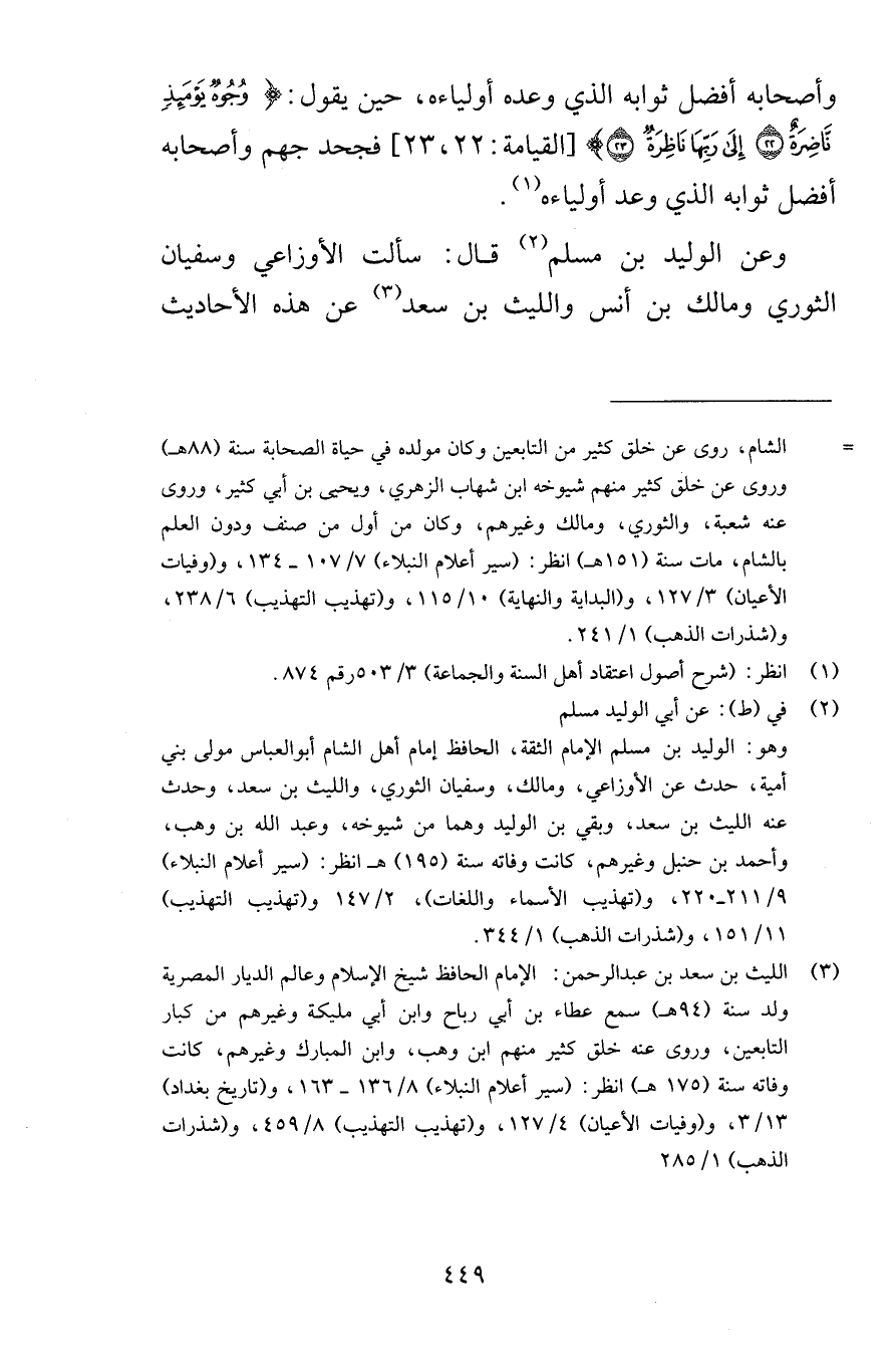 وأصحابه أفضل ثوابه الذي وعده أولياءه حين يقول وُجُوهٌ يَوْمَئِذٍ نَّاضِرَةٌ {22} إِلَى رَبِّهَا نَاظِرَةٌ {23} [القيامة 22-23] فجحد جهم وأصحابه أفضل ثوابه الذي وعد أولياءه وعن الوليد بن مسلم قال سألت الأوزاعي وسفيان الثوري ومالك بن أنس والليث بن سعد عن هذه الأحاديث