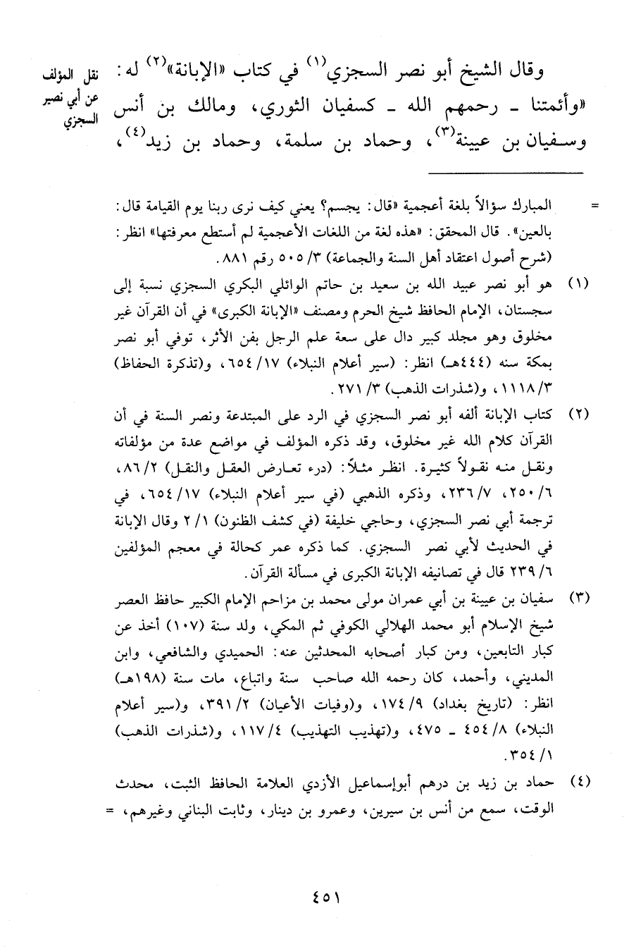 وقال الشيخ أبو نصر السجزي في كتاب الإبانة له وأئمتنا رحمهم الله كسفيان الثوري ومالك بن أنس وسفيان بن عيينة وحماد بن سلمة وحماد بن زيد