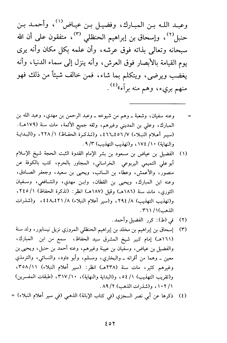 وعبد الله بن المبارك وفضيل بن عياض وأحمد بن حنبل وإسحاق بن إبراهيم الحنظلي متفقون على أن الله سبحانه وتعالى بذاته فوق عرشه وأن علمه بكل مكان وأنه يرى يوم القيامة بالأبصار فوق العرش وأنه ينزل إلى سماء الدنيا وأنه يغضب ويرضى ويتكلم بما شاء فمن خالف شيئاً من ذلك فهو منهم بريء وهم منه برآء