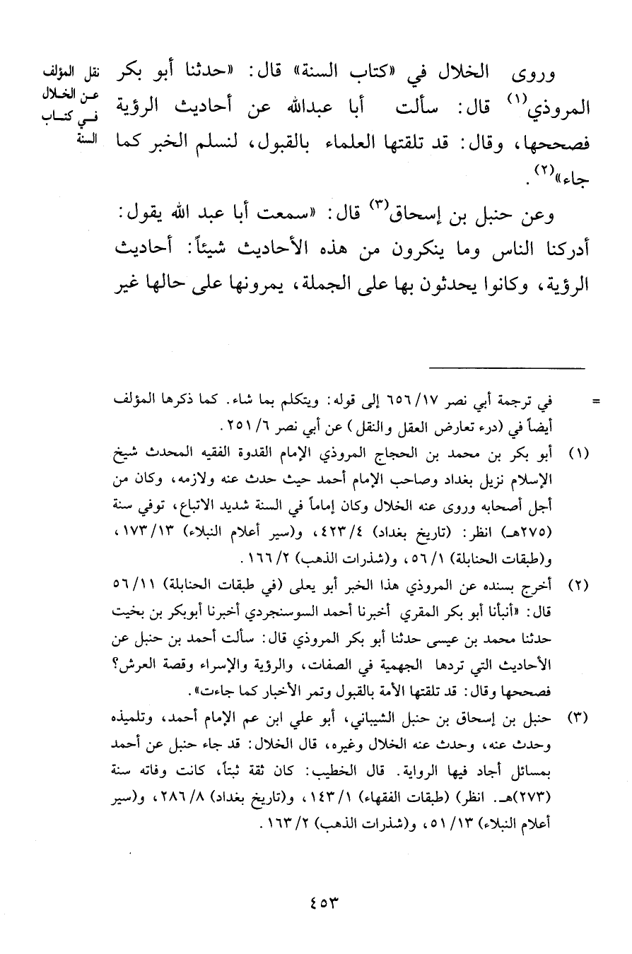 وروى الخلال في كتاب السنة قال حدثنا أبو بكر المروذي قال سألت أبا عبد الله عن أحاديث الرؤية فصححها وقال قد تلقتها العلماء بالقبول لنسلم الخبر كما جاء وعن حنبل بن إسحاق قال سمعت أبا عبد الله يقول أدركنا الناس وما ينكرون من هذه الأحاديث شيئاً أحاديث الرؤية وكانوا يحدثون بها على الجملة يمرونها على حالها غير