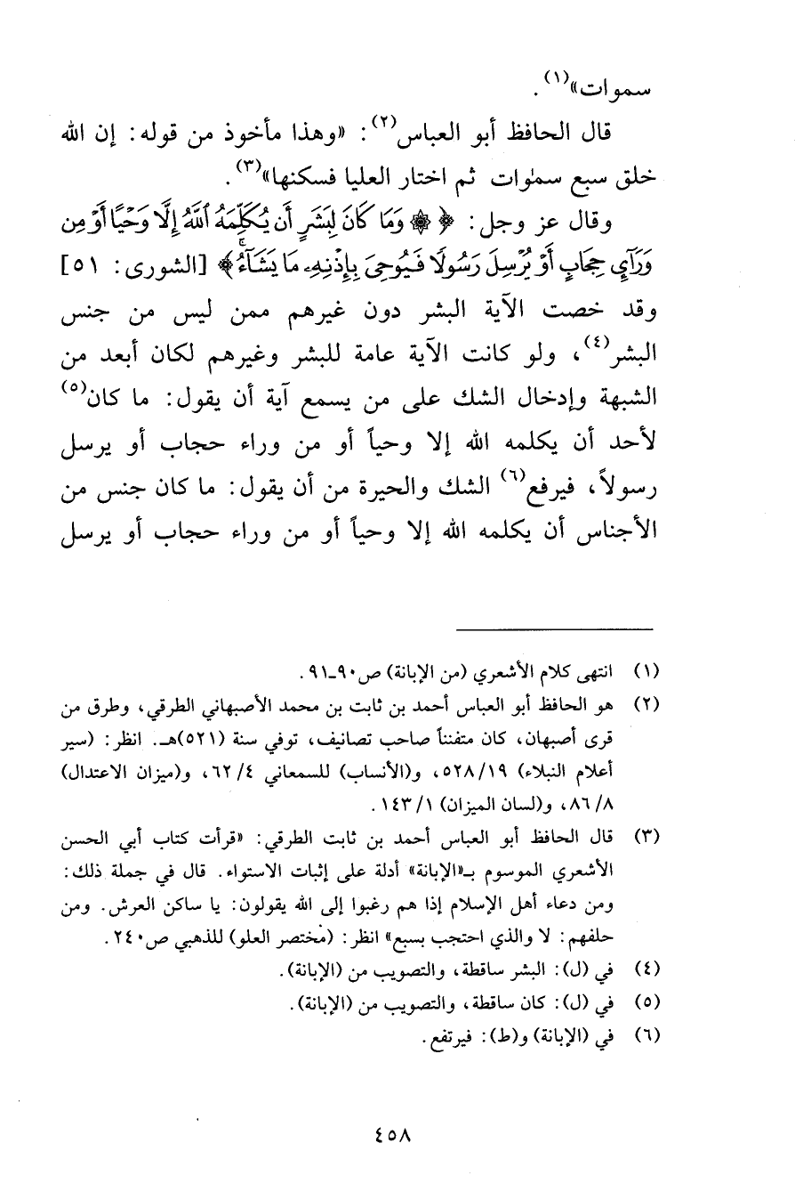 سموات قال الحافظ أبو العباس وهذا مأخوذ من قوله إن الله خلق سبع سموات ثم اختار العليا فسكنها وقال عز وجل وَمَا كَانَ لِبَشَرٍ أَن يُكَلِّمَهُ اللَّهُ إِلَّا وَحْياً أَوْ مِن وَرَاء حِجَابٍ أَوْ يُرْسِلَ رَسُولاً فَيُوحِيَ بِإِذْنِهِ مَا يَشَاءُ [الشورى 51] وقد خصت الآية البشر دون غيرهم ممن ليس من جنس البشر ولو كانت الآية عامة للبشر وغيرهم لكان أبعد من الشبهة وإدخال الشك على من يسمع آية أن يقول ما كان لأحد أن يكلمه الله إلا وحياً أو من وراء حجاب أو يرسل رسولاً فيرفع الشك والحيرة من أن يقول ما كلن جنس من الأجناس أن يكلمه الله إلا وحياً أو من وراء حجاب أو يرسل