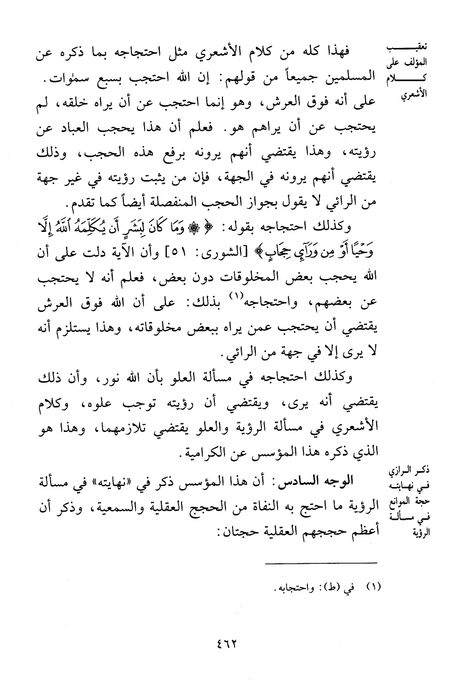 فهذا كله من كلام الأشعري مثل احتجاجه بما ذكره عن المسلمين جميعاً من قولهم إن الله احتجب بسمع سموات على أنه فوق العرش وهو إنما احتجب عن أن يراه خلقه لم يحتجب عن أن يراهم هو فعلم أن هذا يحجب العباد عن رؤيته وهذا يقتضي أنهم يرونه برفع هذه الحجب وذلك يقتضي أنهم يرونه في الجهة فإن من يثبت رؤيته في غير جهة من الرائي لا يقول بجواز الحجب المنفصلة أيضاً كما تقدم وكذلك احتجابه بقوله وَمَا كَانَ لِبَشَرٍ أَن يُكَلِّمَهُ اللَّهُ إِلَّا وَحْياً أَوْ مِن وَرَاء حِجَابٍ [الشورى 51] وأن الآية دلت على أن الله يحجب بعض المخلوقات دون بعض فعلم أنه لا يحتجب عن بعضهم واحتجاجه بذلك على أن الله فوق العرش يقتضي أن يحتجب عمن يراه ببعض مخلوقاته وهذا يستلزم أنه لا يرى إلا في جهة من الرائي وكذلك احتجاجه في مسألة العلو بأن الله نور وأن ذلك يقتضي أنه يرى ويقتضي أن رؤيته توجب علوه وكلام الأشعري في مسألة الرؤية والعلو يقتضي تلازمهما وهذا هو الذي ذكره هذا المؤسس عن الكرامية الوجه السادس أن هذا المؤسس ذكر في نهايته في مسألة الرؤية ما احتج به النفاة من الحجج العقلية والسمعية وذكر أن أعظم حججهم العقلية حجتان