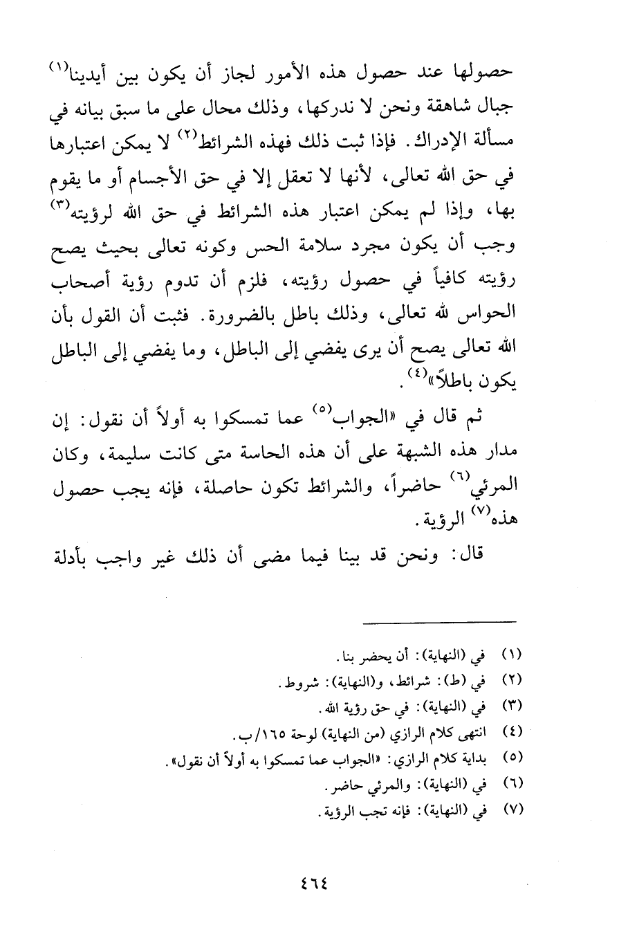 حصولها عند حصول هذه الأمور لجاز أن يكون بين أيدينا جبال شاهقة ونحن لا ندركها وذلك محال على ما سبق بيانه في مسألة الإدراك فإذا ثبت ذلك فهذه الشرائط لا يمكن اعتبارها في حق الله تعالى لأنها لا تعقل إلا في حق الأجسام أو ما يقوم بها وإذا لم يمكن اعتبار هذه الشرائط في حق الله لرؤيته وجب أن يكون مجرد سلامة الحس وكونه تعالى بحيث يصح رؤيته كافياً في حصول رؤيته فلزم أن تدوم رؤية أصحاب الحواس لله تعالى وذلك باطل بالضرورة فثبت أن القول بأن الله تعالى يصح أن يرى يفضي إلى الباطل وما يفضي إلى الباطل يكون باطلاً ثم قال في الجواب عما تمسكوا به أولاً أن نقول إن مدار هذه الشبهة على أن هذه الحاسة متى كانت سليمة وكان المرئي حاضراً والشرائط تكون حاصلة فإنه يجب حصوله هذه الرؤية قال ونحن قد بينا فيما مضى أن ذلك غير واجب بأدلة