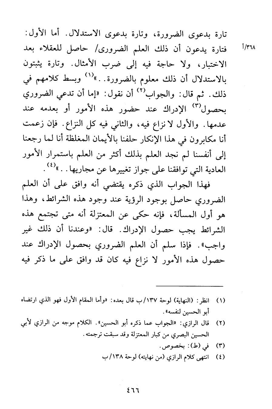 تارة بدعوى الضرورة وتارة بدعوى الاستدلال أما الأول فتارة يدعون أن ذلك العلم الضروري حاصل للعقلاء بعد الاختبار ولا حاجة فيه إلى ضرب الأمثال وتارة يثبتون بالاستدلال أن ذلك معلوم بالضرورة وبسط كلامهم في ذلك ثم قال والجواب أن نقول إما أن تدعي الضروري بحصول الإدراك عند حضور هذه الأمور أو بعدمه عند عدمها والأول لا نزاع فيه والثاني فيه كل النزاع فإن زعمت أنا مكابرون في هذا الإنكار حلفنا بالأيمان المغلظة أنا لما رجعنا إلى أنفسنا لم نجد العلم بذلك أكثر من العلم باستمرار الأمور العادية التي توافقنا على جواز تغييرها عن مجاريها فهذا الجواب الذي ذكره يقتضي أنه وافق على أن العلم الضروري حاصل بوجود الرؤية عند وجود هذه الشرائط وهذا هو أول المسألة فإنه حكى عن المعتزلة أنه متى تجتمع هذه الشرائط يجب حصول الإدراك قال وعندنا أن ذلك غير واجب فإذا سلم أن العلم الضروري بحصول الإدراك عند حصول هذه الأمور لا نزاع فيه كان قد وافق على ما ذكر فيه