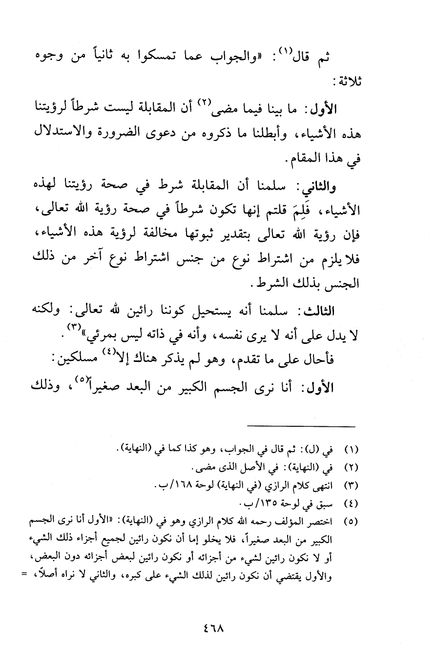 ثم قال والجواب عما تمسكوا به ثانياً عن وجوه ثلاثة الأول ما بينا فيما مضى أن لمقابلة ليست شرطاً لرؤيتنا هذه الأشياء وأبطلنا ما ذكروه من دعوى الضرورة والاستدلال في هذا المقام والثاني سلمنا أن المقابلة شرط في صحة رؤيتنا لهذه الأشياء فَلِمَ قلتم إنها تكون شرطاً في صحة رؤية الله تعالى فإن رؤية الله تعالى بتقدير ثبوتها مخالفة لرؤية هذه الأشياء فلا يلزم من اشتراط نوع من جنس اشتراط نوع آخر من ذلك الجنس بذلك الشرط الثالث سلمنا أنه يستحيل كوننا رائين لله تعالى ولكنه لا يدل على أنه لا يرى نفسه وأنه في ذاته ليس بمرئي فأحال على ما تقدم وهو لم يذكر هناك إلا مسلكين الأول أنا نرى الجسم الكبير من البعد صغيراً وذلك