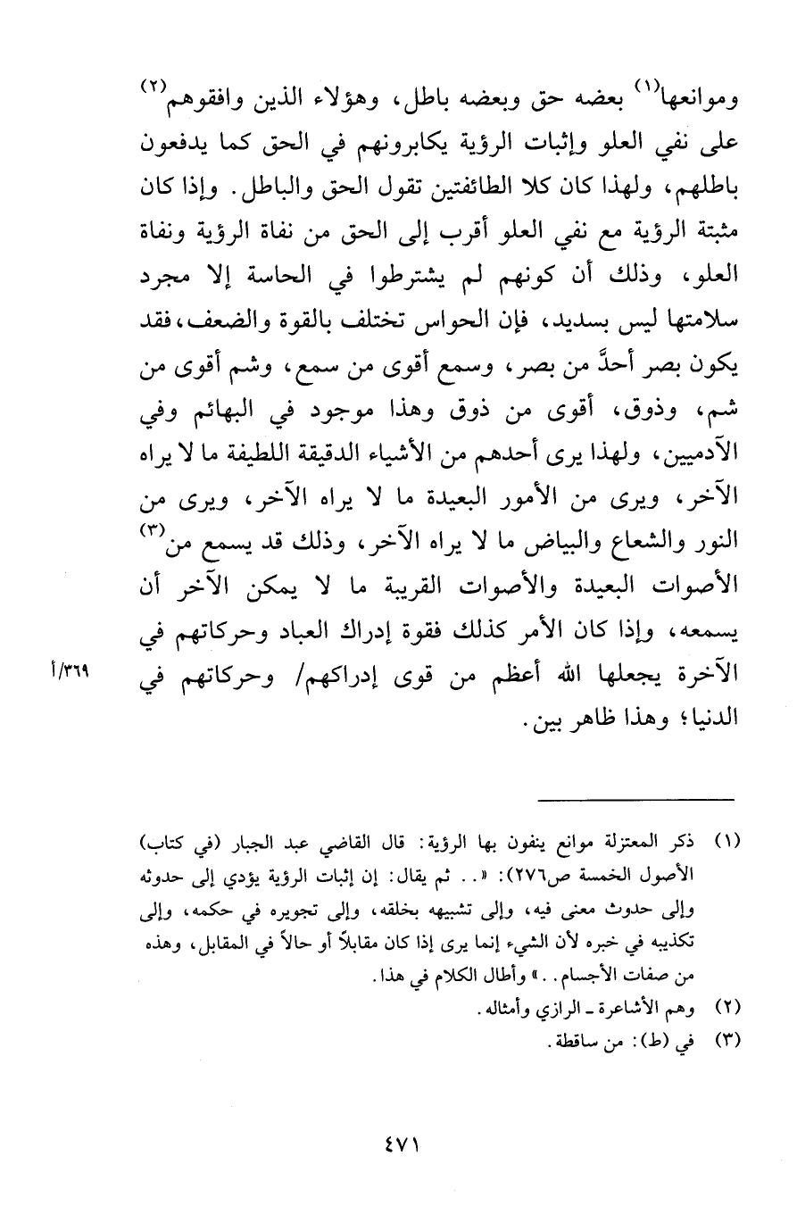 وموانعها بعضها حق وبعضه باطل وهؤلاء الذين وافقوهم على نفي العلو وإثبات الرؤية يكابرونهم في الحق كما يدفعون باطلهم ولهذا كان كلا الطائفتين تقول الحق والباطل وإذا كان مثبتة الرؤية مع نفي العلو أقرب إلى الحق من نفاة الرؤية ونفاة العلو وذلك أن كونهم لم يشترطوا في الحاسة إلا مجرد سلامتها ليس بسديد فإن الحواس تختلف بالقوة والضعف فقد يكون بصر أحدَّ من بصر وسمع أقوى من سمع وشم أقوى من شم وذوق أقوى من ذوق وهذا موجود في البهائم وفي الآدميين ولهذا يرى أحدهم من الأشياء الدقيقة اللطيفة ما لا يراه الآخر ويرى من الأمور البعيدة ما يراه الآخر ويرى من النور والشعاع والبياض ما لا يراه الآخر وذلك قد يسمع من الأصوات البعيدة والأصوات القريبة ما لا يمكن الآخر أن يسمعه وإذا كان الأمر كذلك فقوة إدراك العباد وحركاتهم في الآخرة يجعلها الله أعظم من قوى إدراكهم وحركاتهم في الدنيا وهذا ظاهر بين