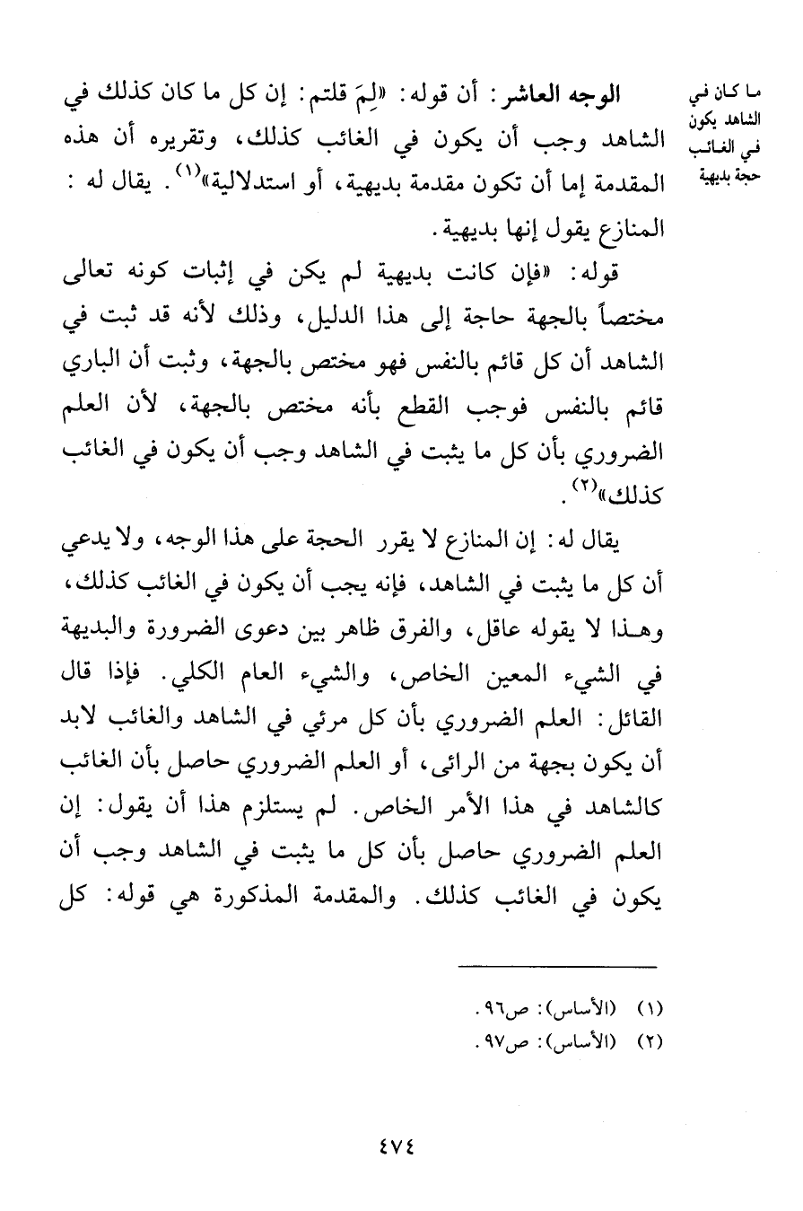 الوجه العاشر أن قوله لِمَ قلتم إن كل ما كان كذلك في الشاهد وجب أن يكون في الغائب كذلك وتقريره أن هذه المقدمة إما أن تكون مقدمة بديهية أو استدلالية يقال له المنازع يقول إنها بديهية قوله فإن كانت بديهية لم يكن في إثبات كونه تعالى مختصاً بالجهة حاجة إلى هذا الدليل وذلك لأنه قد ثبت في الشاهد أن كل قائم بالنفس فهو مختص بالجهة وثبت أن الباري قائم بالنفس فوجب القطع بأنه مختص بالجهة لأن العلم الضروري بأن كل ما يثبت في الشاهد وجب أن يكون في الغائب كذلك وهذا لا يقوله عاقل والفرق ظاهر بين دعوى الضرورة والبديهة في الشيء المعين الخاص والشيء العام الكلي فإذا قال القائل العلم الضروري بأن كل مرئي في الشاهد والغائب لابد أن يكون بجهة من الرائي أو العلم الضروري حصل بأن الغائب كالشاهد في هذا الأمر الخاص لم يستلزم هذا أن يقول إن العلم الضروري حاصل بأن كل ما يثبت في الشاهد وجب أن يكون في الغائب كذلك والمقدمة المذكورة هي قوله كل