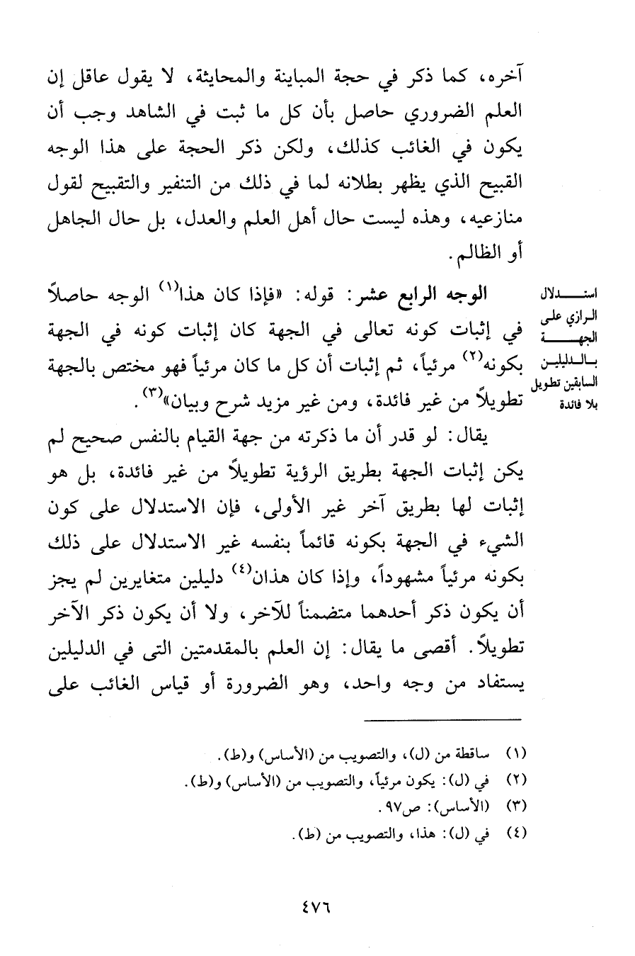 آخره كما ذكر في حجة المباينة والمحايثة لا يقول عاقل إن العلم الضروري حاصل بأن كل ما ثبت في الشاهد وجب أن يكون في الغائب كذلك ولكن ذكر الحجة على هذا الوجه القبيح الذي يظهر بطلانه لما في ذلك من التنفير والتقبيح لقول منازعيه وهذه ليست حال أهل العلم والعدل بل حال الجاهل أو الظالم الوجه الرابع عشر قوله فإذا كان هذا الوجه حاصلاً في إثبات كونه تعالى في الجهة كان إثبات كونه في الجهة بكونه مرئياً ثم إثبات أن كل ما كان مرئياً فهو مختص بالجهة تطويلاً من غير فائدة ومن غير مزيد شرح وبيان يقال لو أن ما ذكرته من جهة القيام بالنفس صحيح لم يكن إثبات الجهة بطريق الرؤية تطويلاً من غير فائدة بل هو إثبات لها بطريق آخر غير الأولى فإن الاستدلال على كون الشيء في الجهة بكونه قائماً بنفسه غير الاستدلال على ذلك بكونه مرئياً مشهوداً وإذا كان هذا دليلين متغايرين لم يجز أن يكون ذكر أحدهما متضمناً للآخر ولا أن يكون ذكر الآخر تطويلاً أقصى ما يقال إن العلم بالمقدمتين التي في الدليلين يستفاد من وجه واحد وهو الضرورة أو قياس الغائب على
