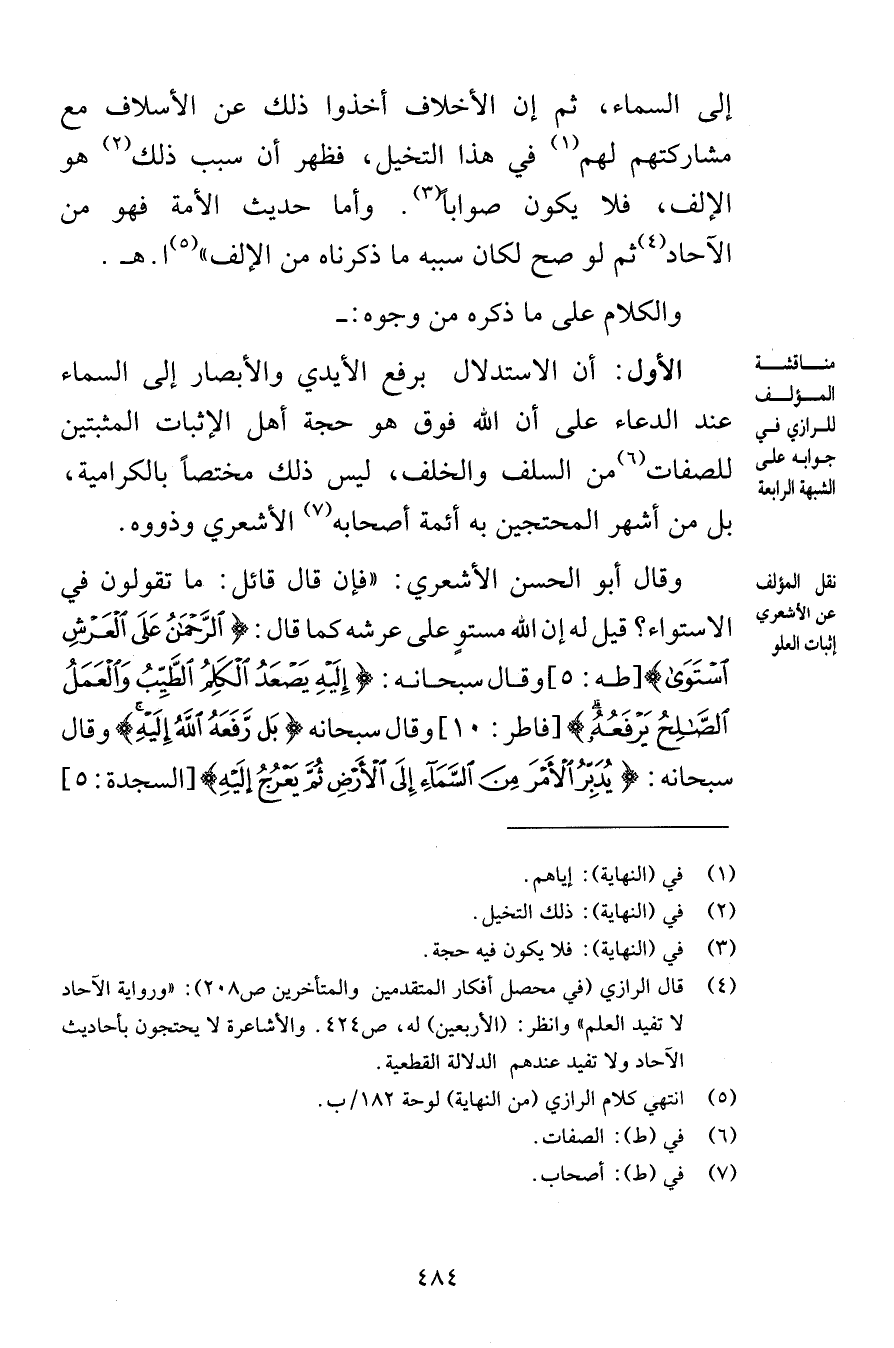 إلى السماء ثم إن الأخلاف أخذوا ذلك عن الأسلاف مع مشاركتهم لهم في هذا التخيل فظهر أن سبب ذلك هو الإلف فلا يكون صواباً وأما حديث الأمة فهو من الآحاد ثم لو صح لكان سببه ما ذكرناه من الإلف اهـ والكلام على ما ذكره من وجوه الأول أن الاستدلال برفع الأيدي والأبصار إلى السماء عند الدعاء على أن الله فوق هو حجة أهل الإثبات المثبتين للصفات من السلف والخلف ليس ذلك مختصاً بالكرامية بل من أشهر المحتجين به أئمة أصحابه الأشعري وذووه وقال أبو الحسن الأشعري فإن قال قائل ما تقولون في الاستواء قيل له إن الله مستوٍ على عرشه كما قال الرَّحْمَنُ عَلَى الْعَرْشِ اسْتَوَى [طه 5] وقال سبحانه إِلَيْهِ يَصْعَدُ الْكَلِمُ الطَّيِّبُ وَالْعَمَلُ الصَّالِحُ يَرْفَعُهُ [فاطر 10] وقال سبحانه بَل رَّفَعَهُ اللهُ إِلَيْهِ وقال سبحانه يُدَبِّرُ الْأَمْرَ مِنَ السَّمَاءِ إِلَى الْأَرْضِ ثُمَّ يَعْرُجُ إِلَيْه [السجدة 5]