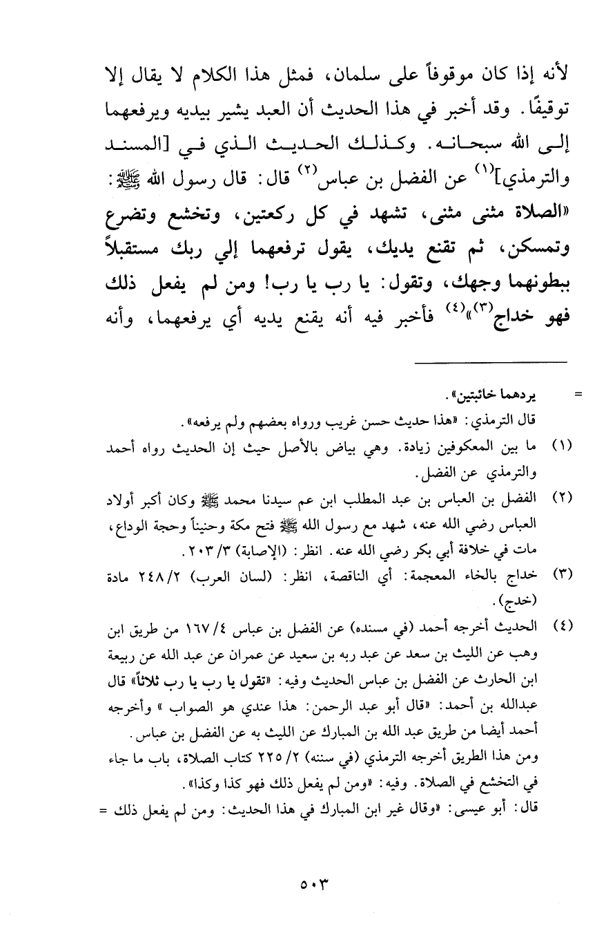 لأنه إذا كان موقوفاً على سلمان فمثل هذا الكلام لا يقال إلا توقيفًا وقد أخبر في هذا الحديث أن العبد يشير بيديه ويرفعهما إلى الله سبحانه وكذلك الحديث الذي في المسند والترمذي عن الفضل بن عباس قال قال رسول الله صلى الله عليه وسلم الصلاة مثنى مثنى تشهد في كل ركعتين وتخشع وتضرع وتمسكن ثم تقنع يديك يقول ترفعهما إلى ربك مستقبلاً ببطونهما وجهك وتقول يا رب يا رب ومن لم يفعل ذلك فهو خداج فأخبر فيه أنه يقنع يديه أي يرفعهما وأنه