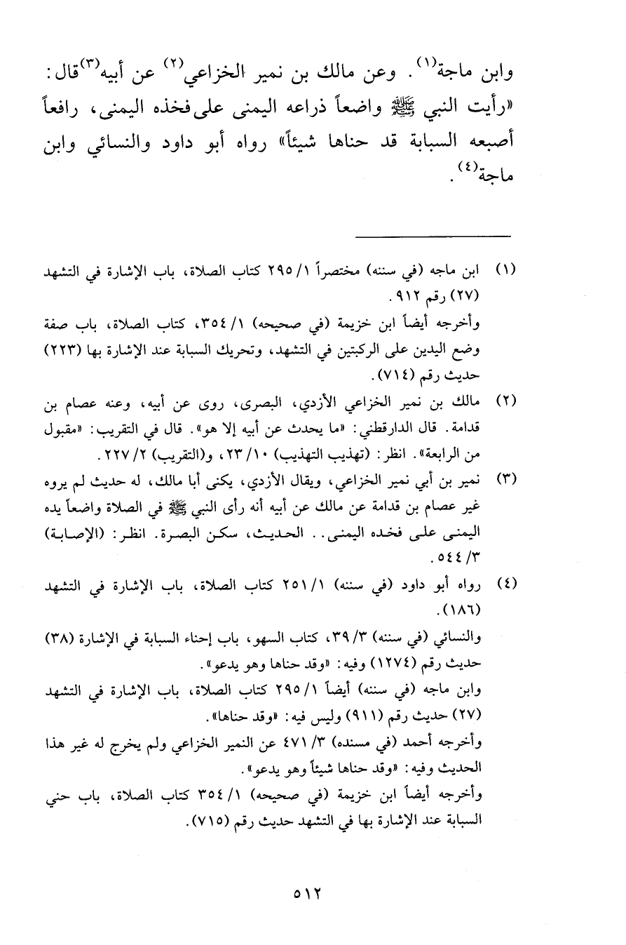 وابن ماجة وعن مالك بن نمير الخزاعي عن أبيه قال رأيت النبي صلى الله عليه وسلم واضعاً ذراعه اليمنى على فخذه اليمنى رافعاً أصبعه السبابة قد حناها شيئاً رواه أبو داود والنسائي وابن ماجة
