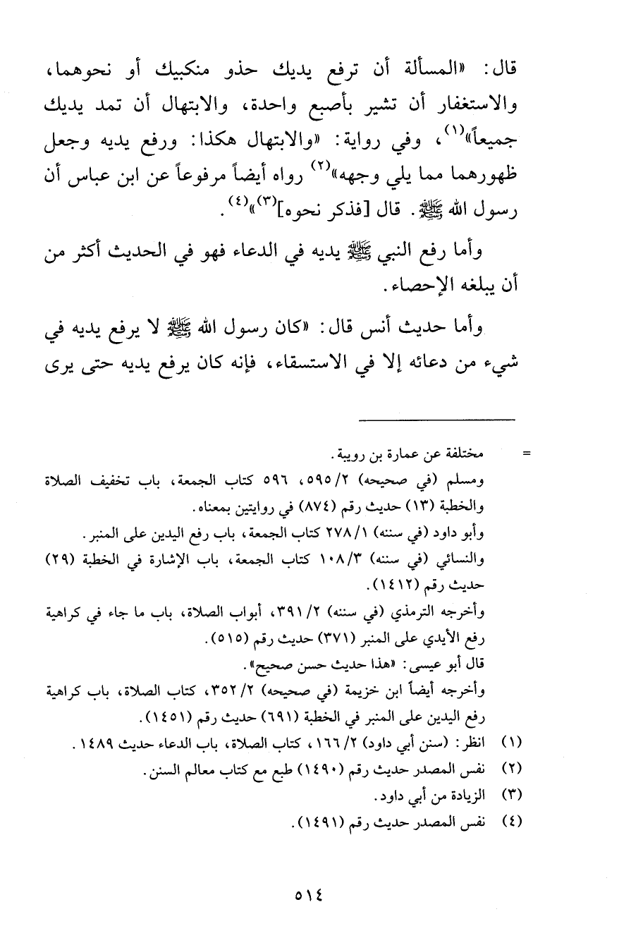 قال المسألة أن ترفع يديك حذو منكبيك أو نحوهما والاستغفار أن تشير بأصبع واحدة والابتهال أن تمد يديك جميعاً وفي رواية والابتهال هكذا ورفع يديه وجعل ظهورهما مما يلي وجهه رواه أيضاً مرفوعاً عن ابن عباس أن رسول الله صلى الله عليه وسلم قال فذكر نحوه وأما رفع النبي صلى الله عليه وسلم يديه في الدعاء فهو في الحديث أكثر من أن يبلغه الإحصاء وأما حديث أنس قال كان رسول الله صلى الله عليه وسلم لا يرفع يديه في شيء من دعائه إلا في الاستسقاء فإنه كان يرفع يديه حتى يرى