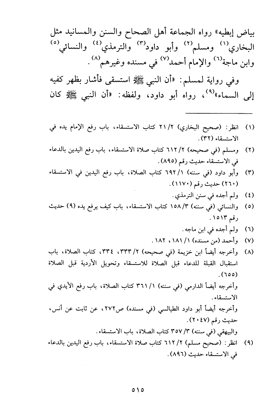 بياض إبطيه رواه الجماعة أهل الصحاح والسنن والمسانيد مثل البخاري ومسلم وأبو داود والترمذي والنسائي وابن ماجة والإمام أحمد في مسنده وغيرهم وفي رواية لمسلم أن النبي صلى الله عليه وسلم استسقى فأشار بظهر كفيه إلى السماء رواه أبو داود ولفظه أن النبي صلى الله عليه وسلم كان