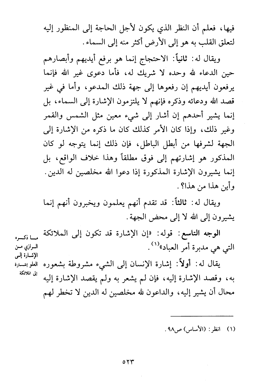 فيها فعلم أن النظر الذي يكون لأجل الحاجة إلى المنظور إليه لتعلق القلب به هو إلى الأرض أكثر منه إلى السماء ويقال له ثانياً الاحتجاج إنما هو برفع أيديهم وأبصارهم حين الدعاء لله وحده شريك له فأما دعوى غير الله فإنما يرفعون أيديهم إن رفعوها إلى جهة ذلك المدعو وأما في غير قصد الله ودعائه وذكره فإنهم يلتزمون الإشارة إلى السماء بل إنما يشير أحدهم إن أشار إلى شيء معين مثل الشمس والقمر وغير ذلك وإذا كان الأمر كذلك كان ما ذكره من الإشارة إلى الجهة لشرفها من أبطل الباطل فإن ذلك إنما يتوجه لو كان المذكور هو إشارتهم إلى فوق مطلقاً وهذا خلاف الواقع بل إنما يشيرون الإشارة المذكورة إذا دعوا الله مخلصين له الدين وأين هذا من هذا ويقال له ثالثاً قد تقدم أنهم يعلمون ويخبرون أنهم إنما يشيرون إلى الله إلى محض الجهة الوجه التاسع قوله إن الإشارة قد تكون إلى الملائكة التي هي مدبرة أمر العباد يقال له أولاً إشارة الإنسان إلى الشيء مشروطة بشعوره به وقصد الإشارة إليه فإن لم يشعر به ولم يقصد الإشارة إليه محال أن يشير إليه والداعون لله مخلصين له الدين لا تخطر لهم