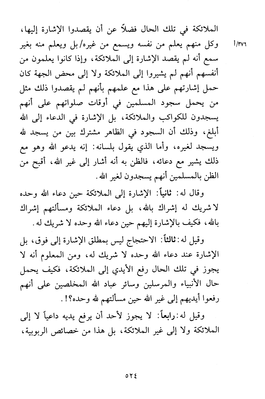 الملائكة في تلك الحال فضلاً عن أن يقصدوا الإشارة إليها وكل منهم يعلم من نفسه ويسمع من غيره بل ويعلم منه بغير سمع أنه لم يقصد الإشارة إلى الملائكة وإذا كانوا يعلمون من أنفسهم أنهم لم يشيروا إلى الملائكة ولا إلى محض الجهة كان حمل إشارتهم على هذا مع علمهم أنهم لم يقصدوا ذلك مثل من يحمل سجود المسلمين في أوقات صلواتهم على أنهم يسجدون للكواكب والملائكة بل الإشارة في الدعاء إلى الله أبلغ وذلك أن السجود في الظاهر مشترك بين من يسجد لله ويسجد لغيره وأما الذي يقول بلسانه إنه يدعو الله وهو مع ذلك يشير مع دعائه فالظن به أنه أشار إلى غير الله أقبح من الظن بالمسلمين أنهم يسجدون لغير الله وقال له ثانياً الإشارة إلى الملائكة حين دعاء الله وحده لا شريك له إشراك بالله بل دعاء الملائكة ومسألتهم إشراك بالله فكيف بالإشارة إليهم حين دعاء الله وحده لا شريك له وقيل له ثالثاً الاحتجاج ليس بمطلق الإشارة إلى فوق بل الإشارة عند دعاء الله وحده لا شريك له ومن المعلوم أنه لا يجوز في تلك الحال رفع الأيدي إلى الملائكة فكيف يحمل حال الأنبياء والمرسلين وسائر عباد الله المخلصين على أنهم رفعوا أيديهم إلى غير الله حين مسألتهم لله وحده وقيل له رابعاً لا يجوز لأحد أن يرفع يديه داعياً لا إلى الملائكة ولا إلى غير الملائكة بل هذا من خصائص الربوبية