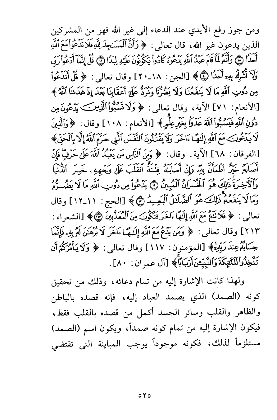 ومن جوز رفع الأيدي عند الدعاء إلى غير الله فهو من المشركين الذين يدعون غير الله قال تعالى وَأَنَّ الْمَسَاجِدَ لِلَّهِ فَلَا تَدْعُوا مَعَ اللَّهِ أَحَداً {18} وَأَنَّهُ لَمَّا قَامَ عَبْدُ اللَّهِ يَدْعُوهُ كَادُوا يَكُونُونَ عَلَيْهِ لِبَداً {19} قُلْ إِنَّمَا أَدْعُو رَبِّي وَلَا أُشْرِكُ بِهِ أَحَداً {20} [الجن 18-20] وقال تعالى قُلْ أَنَدْعُو مِن دُونِ اللهِ مَا لاَ يَنفَعُنَا وَلاَ يَضُرُّنَا وَنُرَدُّ عَلَى أَعْقَابِنَا بَعْدَ إِذْ هَدَانَا اللهُ [الأنعام 71] الآية وقال تعالى وَلاَ تَسُبُّواْ الَّذِينَ يَدْعُونَ مِن دُونِ اللهِ فَيَسُبُّواْ اللهَ عَدْواً بِغَيْرِ عِلْمٍ [الأنعام 108] وقال وَالَّذِينَ لَا يَدْعُونَ مَعَ اللَّهِ إِلَهاً آخَرَ وَلَا يَقْتُلُونَ النَّفْسَ الَّتِي حَرَّمَ اللَّهُ إِلَّا بِالْحَقِّ [الفرقان 68] الآية وقال وَمِنَ النَّاسِ مَن يَعْبُدُ اللَّهَ عَلَى حَرْفٍ فَإِنْ أَصَابَهُ خَيْرٌ اطْمَأَنَّ بِهِ وَإِنْ أَصَابَتْهُ فِتْنَةٌ انقَلَبَ عَلَى وَجْهِهِ خَسِرَ الدُّنْيَا وَالْآخِرَةَ ذَلِكَ هُوَ الْخُسْرَانُ الْمُبِينُ {11} يَدْعُو مِن دُونِ اللَّهِ مَا لَا يَضُرُّهُ وَمَا لَا يَنفَعُهُ ذَلِكَ هُوَ الضَّلَالُ الْبَعِيدُ {12} [الحج 11-12] وقال تعالى فَلَا تَدْعُ مَعَ اللَّهِ إِلَهاً آخَرَ فَتَكُونَ مِنَ الْمُعَذَّبِينَ {213} [الشعراء 213] وقال تعالى وَمَن يَدْعُ مَعَ اللَّهِ إِلَهاً آخَرَ لَا بُرْهَانَ لَهُ بِهِ فَإِنَّمَا حِسَابُهُ عِندَ رَبِّهِ [المؤمنون 117] وقال تعالى وَلاَ يَأْمُرَكُمْ أَن تَتَّخِذُواْ الْمَلاَئِكَةَ وَالنِّبِيِّيْنَ أَرْبَاباً [آل عمران 80] ولهذا كانت الإشارة إليه من تمام دعائه وذلك من تحقيق كونه الصمد الذي يصمد العباد إليه فإنه قصده بالباطن والظاهر والقلب وسائر الجسد أكمل من قصده بالقلب فقط فيكون الإشارة إليه من تمام كونه صمداً ويكون اسم الصمد مستلزماً لذلك فكونه موجوداً يوجب المباينة التي تقتضي