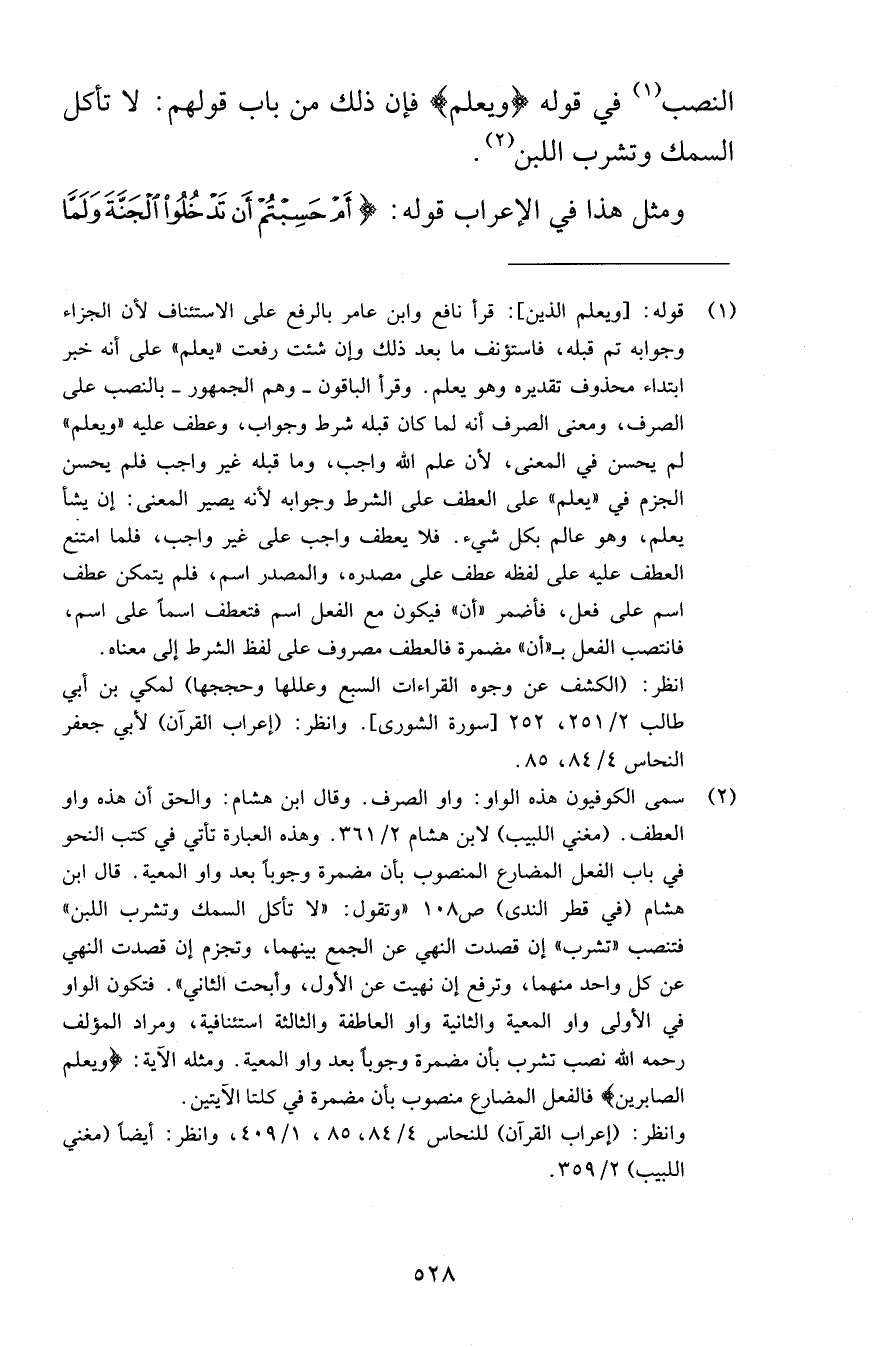 النصب في قوله وَيَعْلَمَ فإن ذلك من باب قولهم لا تأكل السمك وتشرب اللبن ومثل هذا في الإعراب قوله أَمْ حَسِبْتُمْ أَن تَدْخُلُواْ الْجَنَّةَ وَلَمَّا