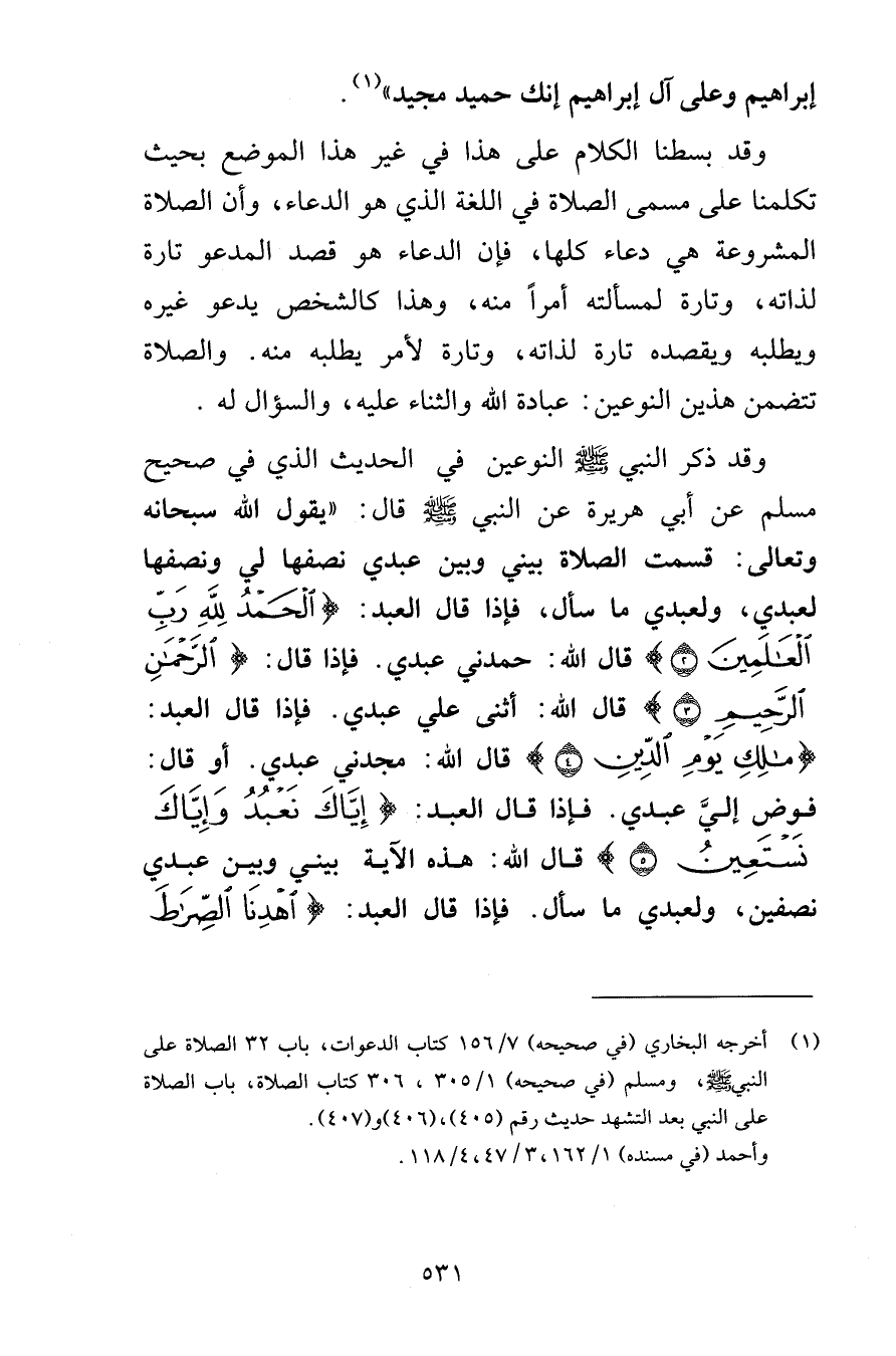 إبراهيم وعلى أل إبراهيم إنك حميد مجيد وقد بسطنا الكلام على هذا في غير هذا الموضع بحيث تكلمنا على مسمى الصلاة في اللغة الذي هو الدعاء وأن الصلاة المشروعة هي دعاء كلها فإن الدعاء هو قصد المدعو تارة لذاته وتارة لمسألته أمراً منه وهذا كالشخص يدعو غيره ويطلبه ويقصده تارة لذاته وتارة لأمر يطلبه منه والصلاة تتضمن هذين النوعين عبادة الله والثناء عليه والسؤال له وقد ذكر النبي صلى الله عليه وسلم النوعين في الحديث الذي في صحيح مسلم عن أبي هريرة عن النبي صلى الله عليه وسلم قال يقول الله سبحانه وتعالى قسمت الصلاة بيني وبين عبدي نصفها لي ونصفها لعبدي ولعبدي ما سأل فإذا قال العبد الْحَمْدُ للهِ رَبِّ الْعَالَمِينَ {2} قال الله حمدني عبدي فإذا قال الرَّحْمنِ الرَّحِيمِ {3} قال الله أثنى علي عبدي فإذا قال العبد مَالِكِ يَوْمِ الدِّينِ {4} قال الله مجدني عبدي أو قال فوض إليَّ عبدي فإذا قال اعبد إِيَّاكَ نَعْبُدُ وإِيَّاكَ نَسْتَعِينُ {5} قال الله هذه الآية بيني وبين عبدي نصفين ولعبدي ما سأل فإذا قال العبد اهدِنَا الصِّرَاطَ