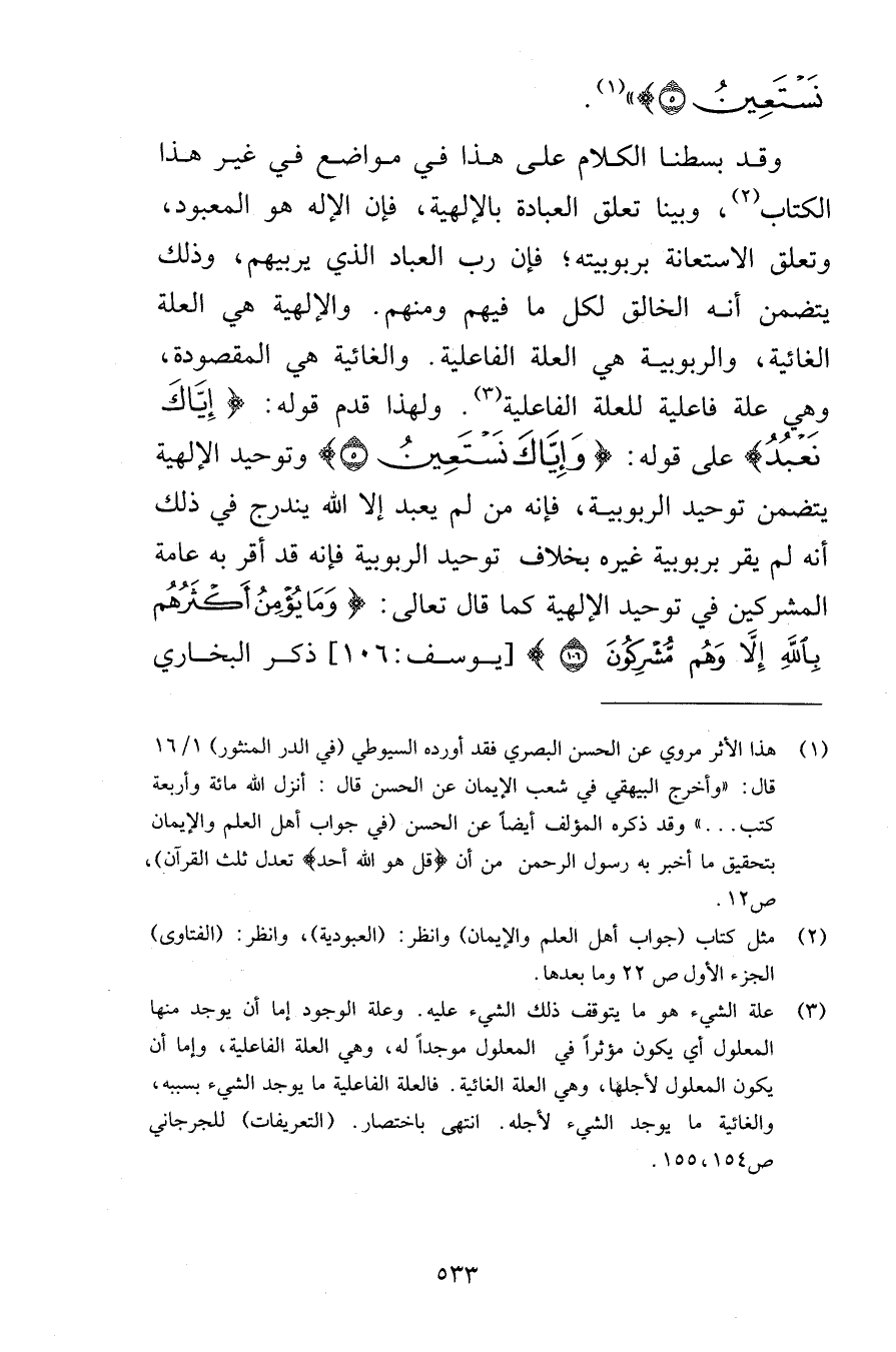 نَسْتَعِينُ {5} وقد بسطنا الكلام على هذا في مواضع في غير هذا الكتاب وبينا تعلق العبادة بالإلهية فإن الإله هو المعبود وتعلق الاستعانة بربوبيته فإن رب العباد الذي يربيهم وذلك يتضمن أنه الخالق لكل م فيهم ومنهم والإلهية هي العلة الغائية ولربوبية هي العلة الفاعلية والغائية هي المقصودة وهي علة فاعلية للعلة الفاعلية ولهذا قدم قوله إِيَّاكَ نَعْبُدُ على قوله وإِيَّاكَ نَسْتَعِينُ {5} وتوحيد الإلهية يتضمن توحيد الربوبية فإنه من لم يعبد إلا الله يندرج في ذلك أنه لم يقر بربوبية غيره بخلاف توحيد الربوبية فإنه قد أقر به عامة المشركين في توحيد الإلهية كما قال تعالى وَمَا يُؤْمِنُ أَكْثَرُهُمْ بِاللهِ إِلاَّ وَهُم مُّشْرِكُونَ {106} [يوسف 106] ذكر البخاري