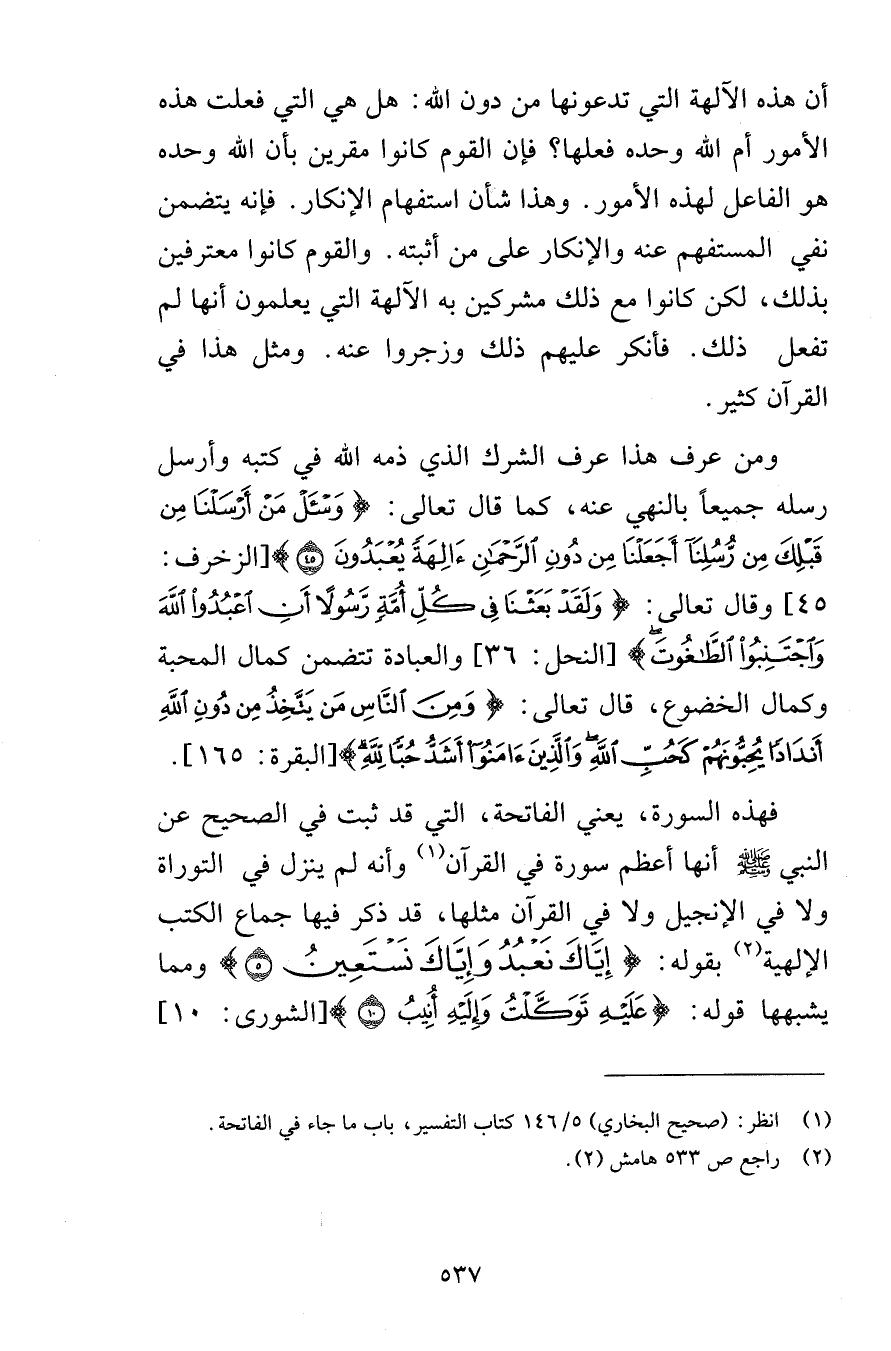 أن هذه الآلهة التي تدعونها من دون الله هل هي التي فعلت هذه الأمور أم الله وحده فعلها فإن القوم كانوا مقرين بأن الله وحده هو الفاعل لهذه الأمور وهذا شأن استفهام الإنكار فإنه يتضمن نفي المستفهم عنه والإنكار على من أثبته والقوم كانوا معترفين بذلك لكن كانوا مع ذلك مشركين به الآلهة التي يعلمون أنها لم تفعل ذلك فأنكروا عليهم ذلك وزجروا عنه ومثل هذا في القرآن كثير ومن عرف هذا عرف الشرك الذي ذمه الله في كتبه وأرسل رسله جميعاً بالنهي عنه كما قال تعالى وَاسْأَلْ مَنْ أَرْسَلْنَا مِن قَبْلِكَ مِن رُّسُلِنَا أَجَعَلْنَا مِن دُونِ الرَّحْمَنِ آلِهَةً يُعْبَدُونَ {45} [الزخرف 45] وقال تعالى وَلَقَدْ بَعَثْنَا فِي كُلِّ أُمَّةٍ رَّسُولاً أَنِ اعْبُدُواْ اللهَ وَاجْتَنِبُواْ الطَّاغُوتَ [النحل 36] والعبادة تتضمن كمال المحبة وكمال الخضوع قال تعالى وَمِنَ النَّاسِ مَن يَتَّخِذُ مِن دُونِ اللهِ أَندَاداً يُحِبُّونَهُمْ كَحُبِّ اللهِ وَالَّذِينَ آمَنُواْ أَشَدُّ حُبّاً لِّلّهِ [البقرة 165] فهذه السورة يعني الفاتحة التي قد ثبت في الصحيح عن النبي صلى الله عليه وسلم أنها أعظم سورة في القرآن وأنه لم ينز في التوراة ولا في الإنجيل ولا في القرآن مثلها وقد ذكر فيها جماع الكتب الإلهية بقوله إِيَّاكَ نَعْبُدُ وإِيَّاكَ نَسْتَعِينُ {5} ومما يشبهها قوله عَلَيْهِ تَوَكَّلْتُ وَإِلَيْهِ أُنِيبُ {10}