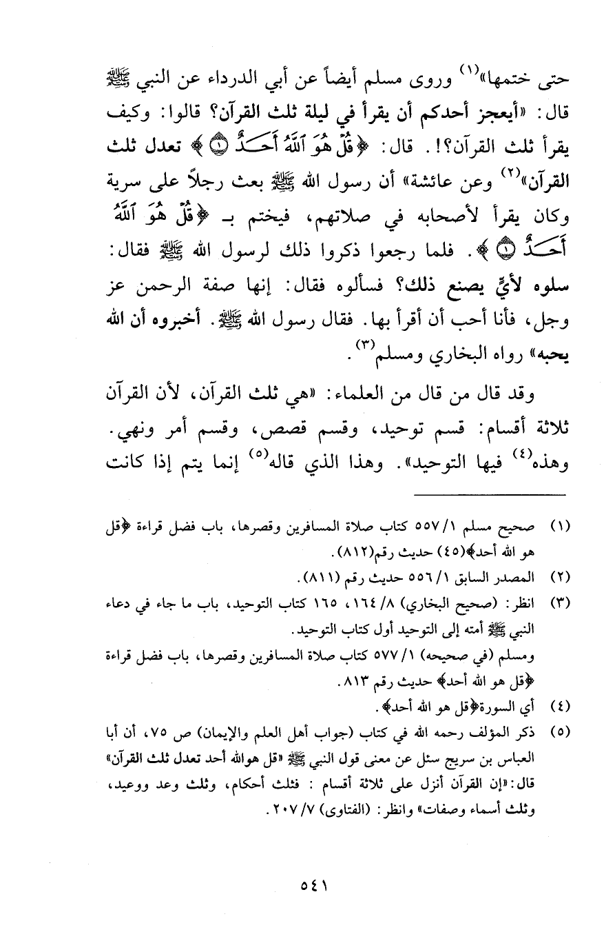 حتى ختمها وروى مسلم أيضاً عن أبي الدرداء عن النبي صلى الله عليه وسلم قال أيعجز أحدكم أن يقرأ في ليلة ثلث القرآن قال قُلْ هُوَ اللَّهُ أَحَدٌ {1} تعد ثلث القرآن وعن عائشة أن رسول الله صلى الله عليه وسلم بعث رجلاً على سرية وكان يقرأ لأصحابه في صلاتهم فكن يختم ب قُلْ هُوَ اللَّهُ أَحَدٌ {1} فلما رجعوا ذكروا ذلك لرسول الله صلى الله عليه وسلم فقال سلوه لأيٍّ يصنع ذلك فسألوه فقال إنها صفة الرحمن وجل فأنا أحب أن أقرأ بها فقال رسول الله صلى الله عليه وسلم أخبروه أن الله يحبه رواه البخاري ومسلم وقد قال من قال من العلماء هي ثلث القرآن لأن القرآن ثلاثة أقسام قسم توحيد وقسم قصص وقسم أمر ونهي وهذه فيها التوحيد وهذا الذي قاله إنما يتم إذا كانت