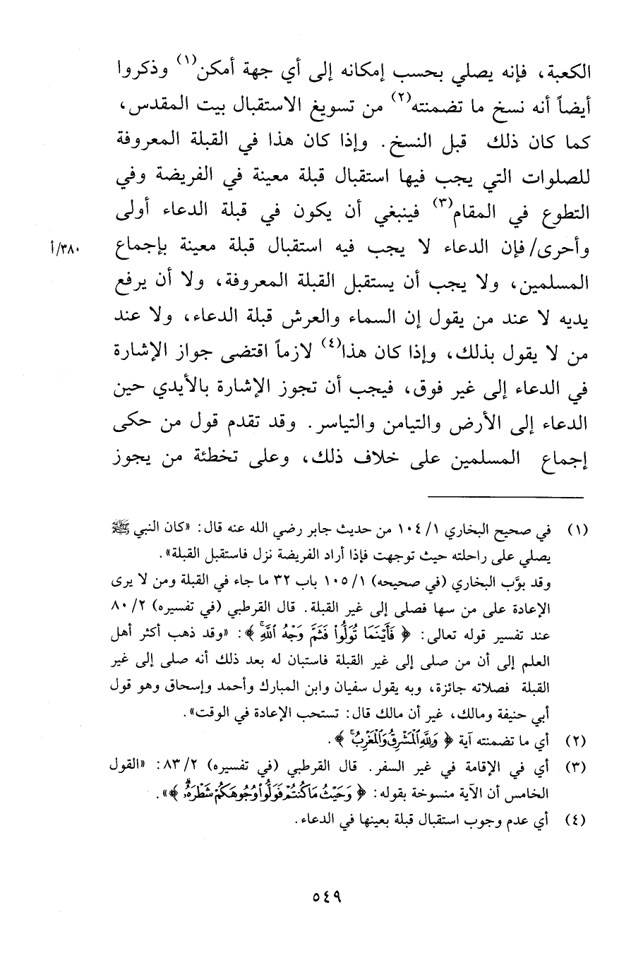 الكعبة فإنه يصلي بحسب إمكانه إلى أي جهة أمكن وذكروا أيضاً أنه نسخ ما تضمنته من تسويغ الاستقبال بيت المقدس كما كان ذلك قبل النسخ وإذا كان هذا في القبلة المعروفة للصلوات التي يجب فيها استقبال قبلة معينة في الفريضة وفي التطوع في المقام فينبغي أن يكون في قبلة الدعاء أولى وأحرى فإن الدعاء لا يجب فيه استقبال قبلة معينة بإجماع المسلمين ولا يجب أن يستقبل القبلة المعروفة ولا أن يرفع يديه لا عند من يقول إن السماء والعرش قبلة الدعاء ولا عند من لا يقول بذلك وإذا كان هذا لازماً اقتضى جواز الإشارة في الدعاء إلى غير فوق فيجب أن تجوز الإشارة بالأيدي حين الدعاء إلى الأرض والتيامن والتياسر وقد تقدم قول من حكى إجماع المسلمين على خلاف ذلك وعلى تخطئة من يجوز