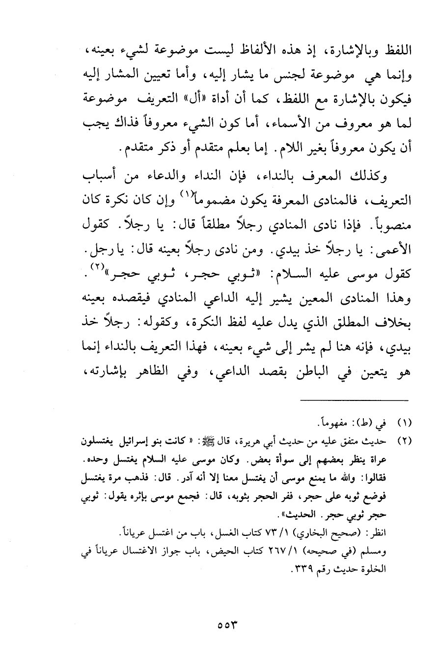اللفظ وبالإشارة إذ هذه الألفاظ ليست موضوعة لشيء بعينه وإنما هي موضوعة لجنس ما يشار إليه وأما تعيين المشار إليه فيكون بالإشارة مع اللفظ كم أن أداة أل التعريف موضوعة لما هو معروف من الأسماء أما كون الشيء معروفاً فذاك يجب أن يكون معروفاً بغير اللام إما بعلم متقدم أو ذكر متقدم وكذلك المعرف بالنداء فإن النداء والدعاء من أسباب التعريف فالمنادي المعرفة يكون مضموماً وإن كان نكرة كان منصوباً فإذا نادى المنادي رجلاً مطلقاً قال يا رجلاً كقول الأعمى يا رجلاً خذ بيدي ومن نادى رجلاً بعينه قال يا رجل كقول موسى عليه السلام ثوبي حجر ثوبي حجر وهذا المنادى المعين يشير إليه الداعي المنادي فيقصده بعينه بخلاف المطلق الذي يدل عليه لفظ النكرة وكقوله رجلاً خذ بيدي فإنه هنا لم يشر إلى شيء بعينه فهذا التعريف بالنداء إنما هو يتعين في الباطن بقصد الداعي وفي الظاهر بإشارته