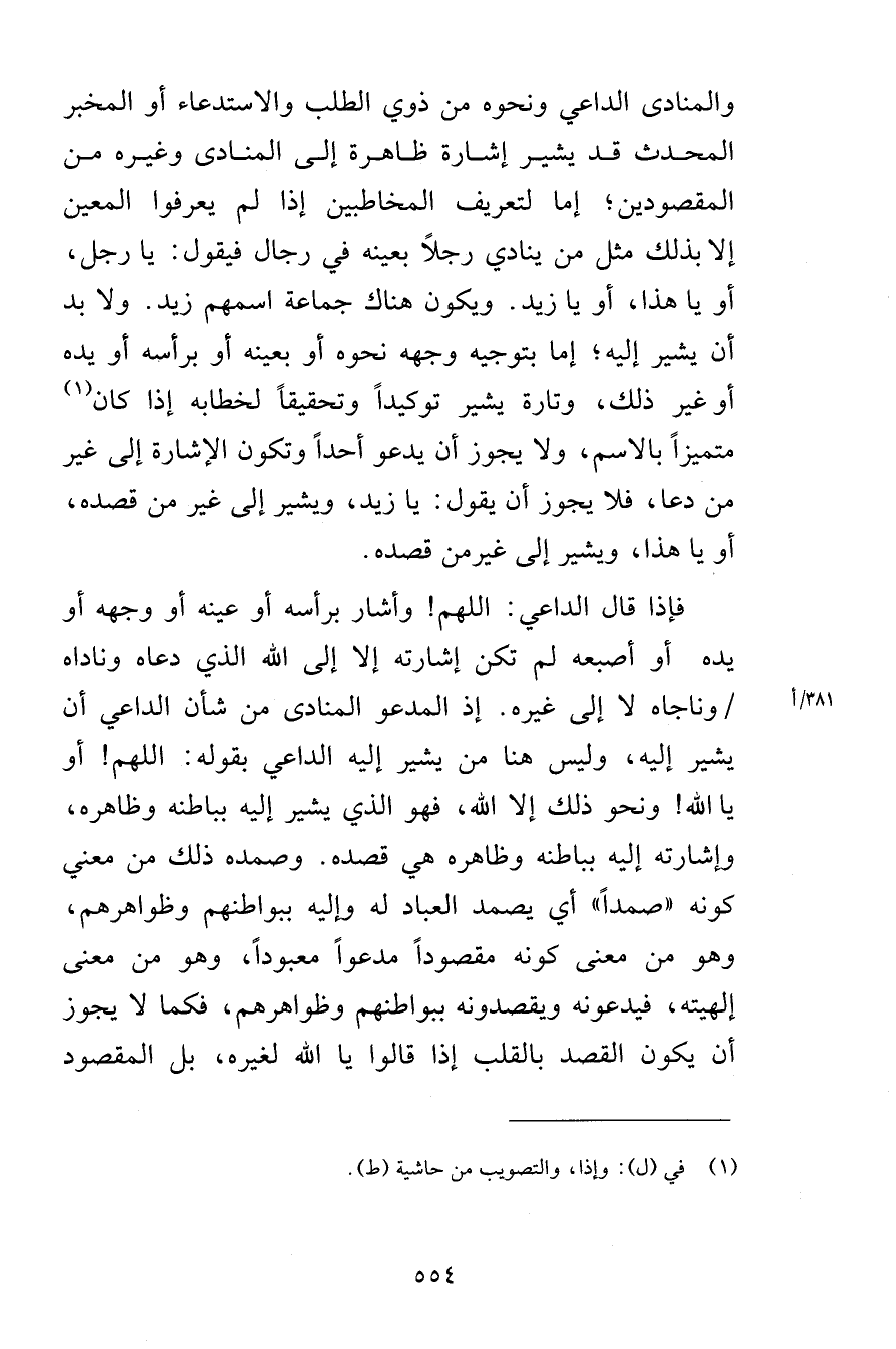 والمنادى الداعي ونحوه من ذوي الطلب والاستدعاء أو المخبر المحدث قد يشير إشارة ظاهرة إلى المنادى وغيره من المقصودين إما لتعريف المخاطبين إذا لم يعرفوا المعين إلا بذلك مثل من ينادي رجلاً بعينه في رجال فيقول يا رجل أو يا هذا أو يا زيد ويكون هناك جماعة اسمهم زيد ولا بد أن يشير إليه إما بتوجيه وجهه نحوه أو بعينه أو برأسه أو يده أو غير ذلك وتارة يشير توكيداً وتحقيقاً لخطابه إذا كان متميزاً بالاسم ولا يجوز أن يدعو أحداً وتكون الإشارة إلى غير من دعا فلا يجوز أن يقول يا زيد ويشير إلى غير من قصده أو يا هذا ويشير إلى غير من قصده فإذا قال الداعي اللهم وأشار برأسه أو عينه أو وجهه أو يده أو أصبعه لم تكن إشارته إلا إلى الله الذي دعاه وناداه وناجاه لا إلى غيره إذ المدعو المنادى من شأن الداعي أن يشير إليه وليس هنا من يشير إليه الداعي بقوله اللهم أو يا الله ونحو ذلك إلا الله فهو الذي يشير إليه بباطنه وظاهره وإشارته إليه بباطنه وظاهره هي قصده وصمده ذلك من معنى كونه صمداً أي يصمد العباد له وإليه ببواطنهم وظواهرهم وهو من معنى كونه مقصوداً مدعواً معبوداً وهو من كمعنى إلهيته فيدعونه ويقصدونه ببواطنهم وظواهرهم فكما لا يجوز أن يكون القصد بالقلب إذا قالوا يا الله لغيره بل المقصود