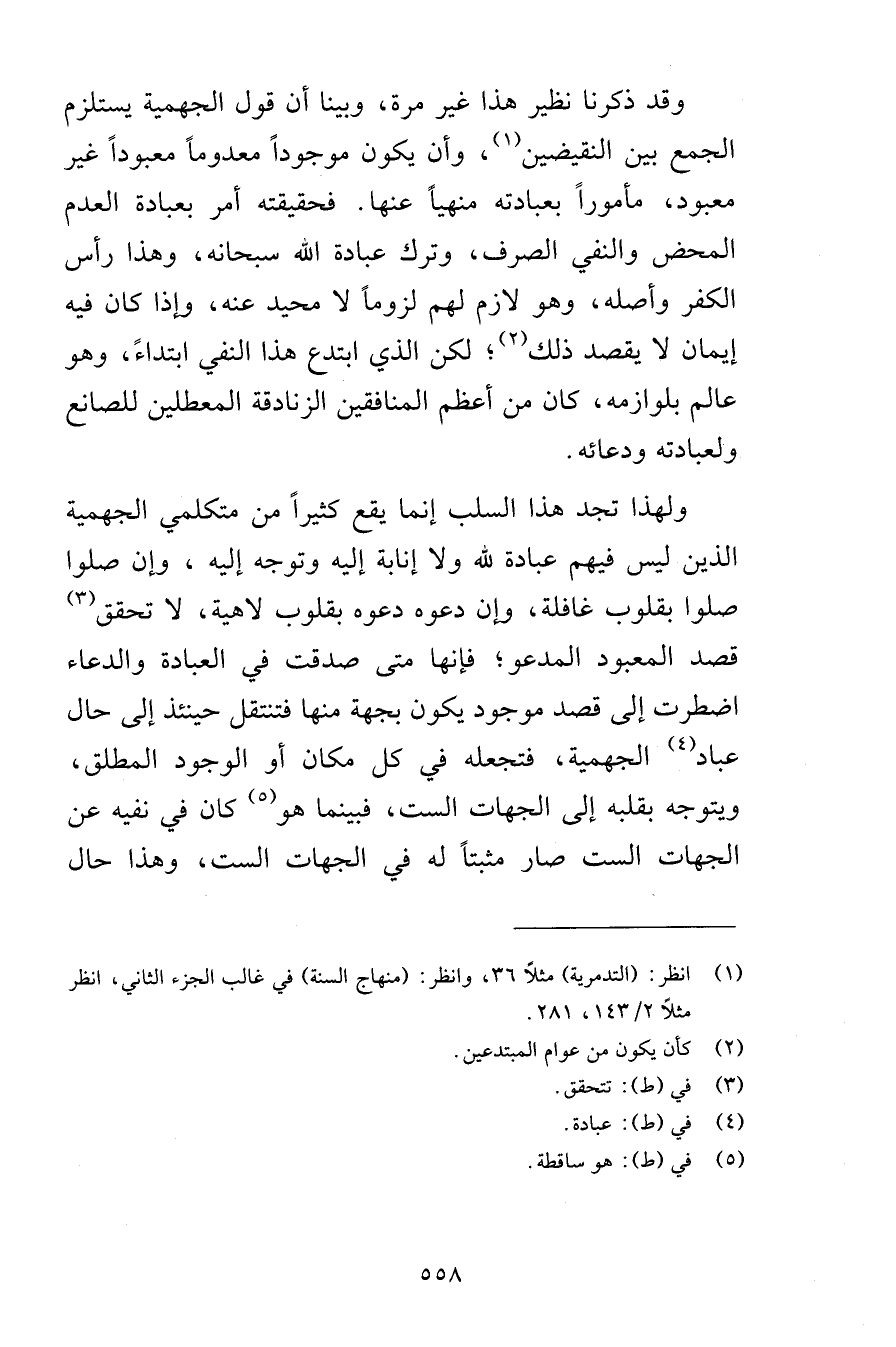 وقد ذكرنا نظير هذا غير مرة وبينا أن قول الجهمية يستلزم الجمع بين النقيضين وأن يكون موجوداً معدوماً معبوداً غير معبود مأموراً بعبادته منهياً عنها فحقيقته أمر بعبادة العدم المحض والنفي الصرف وترك عبادة الله سبحانه وهذا رأس الكفر وأصله وهو لازم لهم لزوماً لا محيد عنه وإذا كان فيه إيمان لا يقصد ذلك لكن الذي ابتدع هذا النفي ابتداءً وهو عالم بلوازمه كان من أعظم المنافقين الزنادقة المعطلين للصانع ولعبادته ودعائه ولهذا تجد هذا السلب إنما يقع كثيراً من متكلمي الجهمية الذين ليس فيهم عبادة لله ولا إنابة إليه وتوجه إليه وإن صلوا صلوا بقلوب غافلة وإن دعوه دعوه بقلوب لاهية لا تحقق قصد المعبود المدعو فإنها متى صدقت في العبادة والدعاء اضطرت إلى قصد موجود يكون بجهة منها فتنتقل حينئذ إلى حال عباد الجهمية فتجعله في كل مكان أو الوجود المطلق ويتوجه بقلبه إلى الجهات الست فبينما هو كان في نفيه عن الجهات الست صار مثبتاً له في الجهات الست وهذا حال