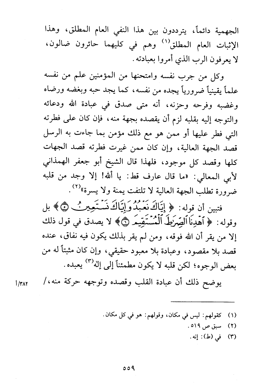 الجهمية دائماً يترددون بين هذا النفي العام المطلق وهذا الإثبات العام المطلق وهم في كليهما حائرون ضالون لا يعرفون الرب الذي أمروا بعبادته وكل من جرب نفسه وامتحنها من المؤمنين علم من نفسه علماً يقينياً ضرورياً يجده من نفسه كما يجد حبه وبغضه ورضاه وغضبه وفرحه وحزنه أنه متى صدق في عبادة الله ودعائه والتوجه إليه بقلبه لزم أن يقصده بجهة منه فإن كان على فطرته التي فطر عليها أو ممن هو مع ذلك مؤمن بما جاءت به الرسل قصد الجهة العالية وإن كان ممن غيرت فطرته قصد الجهات كلها وقصد ك موجود فلهذا قال الشيخ أبو جعفر الهمذاني لأبي المعالي ما قال عارف قط يا ألله إلا وجد من قلبه ضرورة تطلب الجهة العالية لا تلتفت يمنة ولا يسرة فتبين أن قوله إِيَّاكَ نَعْبُدُ وإِيَّاكَ نَسْتَعِينُ {5} بل وقوله اهدِنَا الصِّرَاطَ المُستَقِيمَ {6} لا يصدق في قول ذلك إلا من يقر أن الله فوقه ومن لم يقر بذلك يكون فيه نفاق عنده قصد بلا مقصود وعبادة بلا معبود حقيقي وإن كان مثبتاً له من بعض الوجوه لكن قلبه لا يكون مطمئناً إلى إله يعبده ويوضح ذلك أن عبادة القلب وقصده وتوجهه حركة منه