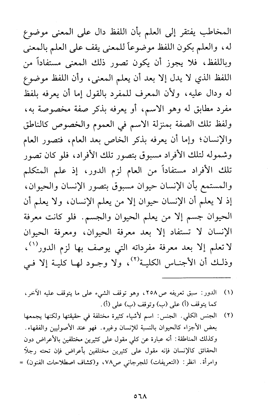 المخاطب يفتقر إلى العلم بأن اللفظ دال على المعنى موضوع له والعلم بكون اللفظ موضوعاً للمعنى يقف على العلم بالمعنى وباللفظ فلا يجوز أن يكون تصور ذلك المعنى مستفاداً من اللفظ الذي لا يدل إلا بعد أن يعلم المعنى وأن اللفظ موضوع له ودال عليه ولأن المعرف للمفرد بالقول إما أن يعرفه بلفظ مفرد مطابق له وهو الاسم أو يعرفه بذكر صفة مخصوصة به ولفظ تلك الصفة بمنزلة الاسم في العموم والخصوص كالناطق والإنسان وإما أن يعرفه بذكر الخاص بعد العام فتصور العام وشموله لتلك الأفراد مسبوق بتصور تلك الأفراد فلو كان تصور تلك الأفراد مستفاداً من العام لزم الدور إذ علم المتكلم والمستمع بأن الإنسان حيوان مسبوق بتصور الإنسان والحيوان إذ لا يعلم أن الإنسان حيوان إلا من يعلم الإنسان ولا يعلم أن الحيوان جسم إلا من يعلم الحيوان والجسم فلو كانت معرفة الإنسان لا تستفاد إلا بعد معرفة الحيوان ومعرفة الحيوان لا تعلم إلا بعد معرفة مفرداته التي يوصف بها لزم الدور وذلك أن الأجناس الكلية ولا وجود لهل كلية إلا في