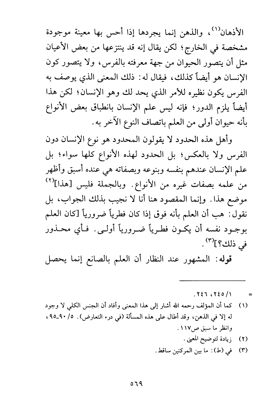 الأذهان والذهن إنما يجردها إذا أحس بها معينة موجودة مشخصة في الخارج لكن يقال إنه قد ينتزعها من بعض الأعيان مثل أن يتصور الحيوان من جهة معرفته بالفرس ولا يتصور كون الإنسان هو أيضاً كذلك فيقال له ذلك المعنى الذي يوصف به الفرس بكون نظيره للأمر الذي يحد لك وهو الإنسان لكن هذا أيضاً يلزم الدور فإنه ليس علم الإنسان بانطباق بعض الأنواع بأنه حيوان أولى من العلم باتصاف النوع الآخر به وأهل هذه الحدود لا يقولون المحدود هو نوع الإنسان دون الفرس ولا بالعكس بل الحدود لهذه الأنواع كلها سواء بل علم الإنسان عندهم بنفسه وبنوعه وبصفاته هي عنده أسبق وأظهر من علمه بصفات غيره من الأنواع وبالجملة فليس هذا موضع هذا وإنما المقصود هنا أنا لا نجيب بذلك الجواب بل نقول هب أن العلم بأنه فوق إذا كان فطرياً ضرورياً كان العلم بوجود نفسه أن يكون فطرياً ضرورياً أولى فأي محذور في ذلك قوله المشهور عند النظار أن العلم بالصانع إنما يحصل