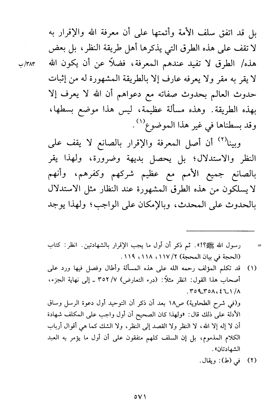 بل قد اتفق سلف الأمة وأئمتها على أن معرفة الله والإقرار به لا تقف على هذه الطرق التي يذكرها أهل طريقة النظر بل بعض هذه الطرق لا تفيد عندهم المعرفة فضلاً عن أن يكون الله لا يقر به مقر ولا يعرفه عارف إلا بالطريقة المشهورة له من إثبات حدوث العالم بحدوث صفاته مع دعواهم أن الله لا يعرف إلا بهذه الطريقة وهذه مسألة عظيمة ليس هذا موضع بسطها وقد بسطناها في غير هذا الموضع وبينا أن أصل المعرفة والإقرار بالصانع لا يقف على النظر والاستدلال بل يحصل بديهة وضرورة ولهذا يقر بالصانع جميع الأمم مع عظيم شركهم وكفرهم وأنهم يسلكون من هذه الطرق المشهورة عند النظار مثل الاستدلال بالحدوث على المحدث وبالإمكان على الواجب ولهذا يوجد