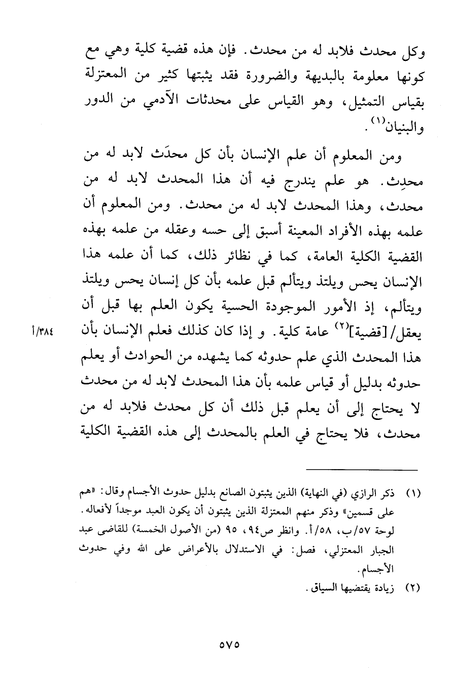 وكل محدث فلابد له من محدث فإن هذه قضية كلية وهي مع كونها معلومة بالبديهة والضرورة فقد يثبتها كثير من المعتزلة بقياس التمثيل وهو القياس على محدثات الآدمي من الدور والبنيان ومن المعلوم أن علم الإنسان بأن كل محدَث لابد له من محدِث هو علم يندرج فيه أن هذا المحدث لابد له من محدث وهذا المحدث لابد له من محدث ومن المعلوم أن علمه بهذه الأفراد المعينة أسبق إلى حسه وعقله من علمه بهذه القضية الكلية العامة كما في نظائر ذلك كما أن علمه هذا الإنسان يحس ويلتذ ويتألم قبل علمه بأن كل إنسان يحس ويلتذ ويتألم إذ الأمور الموجودة الحسية يكون العلم بها قبل أن يعقل قضية عامة كلية وإذا كان كذلك فعلم الإنسان بأن هذا المحدث الذي علم حدوثه كما يشهده من الحوادث أو يعلم حدوثه بدليل أو قياس علمه بأن هذا المحدث لابد له من محدث لا يحتاج إلى أن يعلم قبل ذلك أن كل محدث فلابد له من محدث فلا يحتاج من العلم بالمحدث إلى هذه القضية الكلية