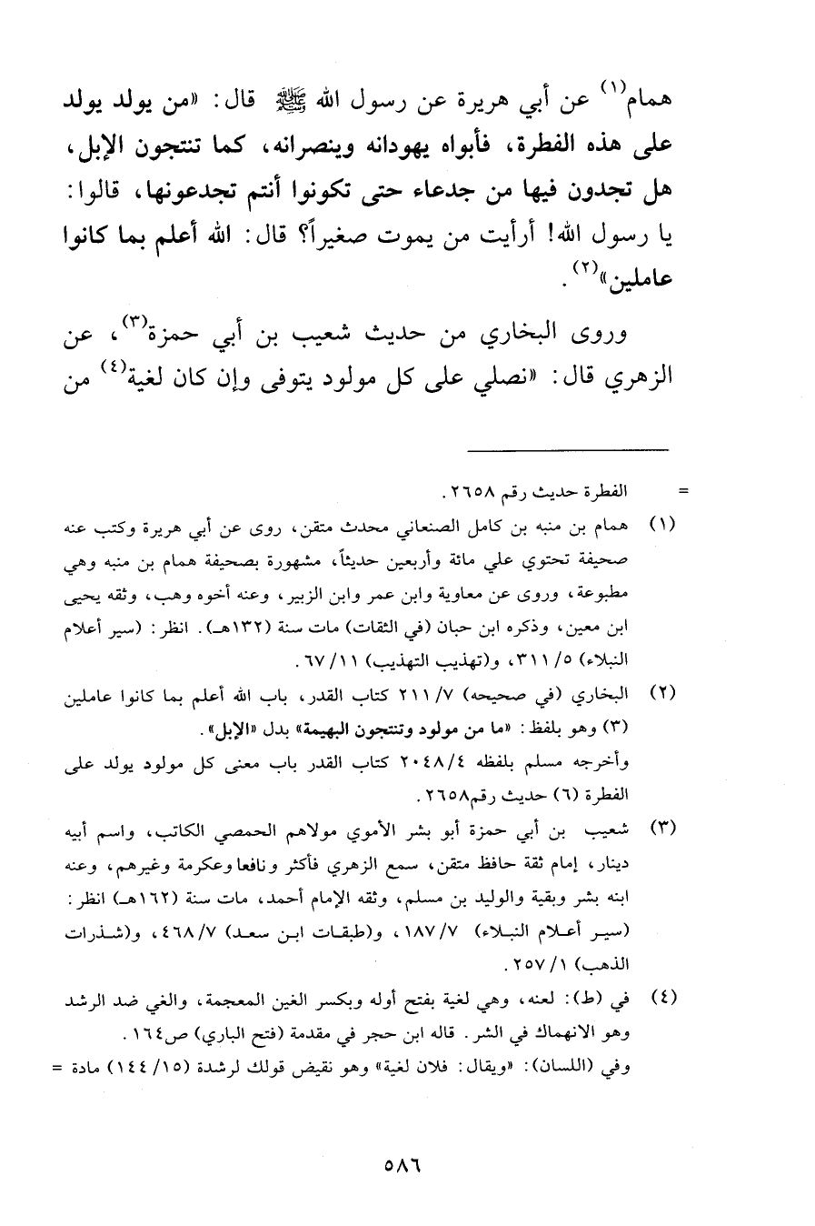 همام عن أبي هريرة عن رسول الله صلى الله عليه وسلم قال من يولد يولد على هذه الفطرة فأبواه يهودانه وينصرانه كما تنتجون الإبل هل تجدون فيها من جدعاء حتى تكونوا أنتم تجدعونها قالوا يا رسول الله أرأيت من يموت صغيراً قال الله أعلم بما كانوا عاملين وروى البخاري من حديث شعيب بن أبي حمزة عن الزهري قال نصلي على كل مولود يتوفى وإن كان لغية من