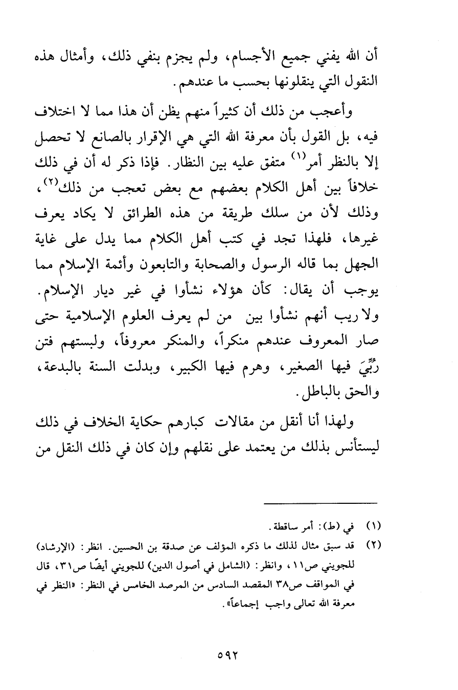 أن الله ينفي جميع الأجسام ولم يجزم بنفي ذلك وأمثال هذه النقول التي ينقلونها بحسب ما عندهم وأعجب من ذلك أن كثيراً منهم يظن أن هذا مما لا اختلاف فيه بل القول بأن معرفة الله التي هي الإقرار بالصانع لا تحصل إلا بالنظر أمر متفق عليه بين النظار فإذا ذكر له أن في ذلك خلافاً بين أهل الكلام بعضهم مع بعض تعجب من ذلك وذلك لأن من سلك طريقة من هذه الطرائق لا يكاد يعرق غيرها فلهذا تجد في كتب أهل الكلام مما يدل على غاية الجهل بما قاله الرسول والصحابة والتابعون وأئمة الإسلام مما يوجب أن يقال كأن هؤلاء نشأوا في غير ديار الإسلام ولا ريب أنهم نشأوا بين من لم يعرف العلوم الإسلامية حتى صار المعروف عندهم منكراً والمنكر معروف ولبستهم فتن رُبِّيَ فيها الصغير وهرم فيها الكبير وبدلت السنة بالبدعة والحق بالباطل ولهذا أنا أنقل من مقالات كبارهم حكاية الخلاف في ذلك ليستأنس بذلك من يعتمد على نقلهم وإن كان في ذلك النقل من